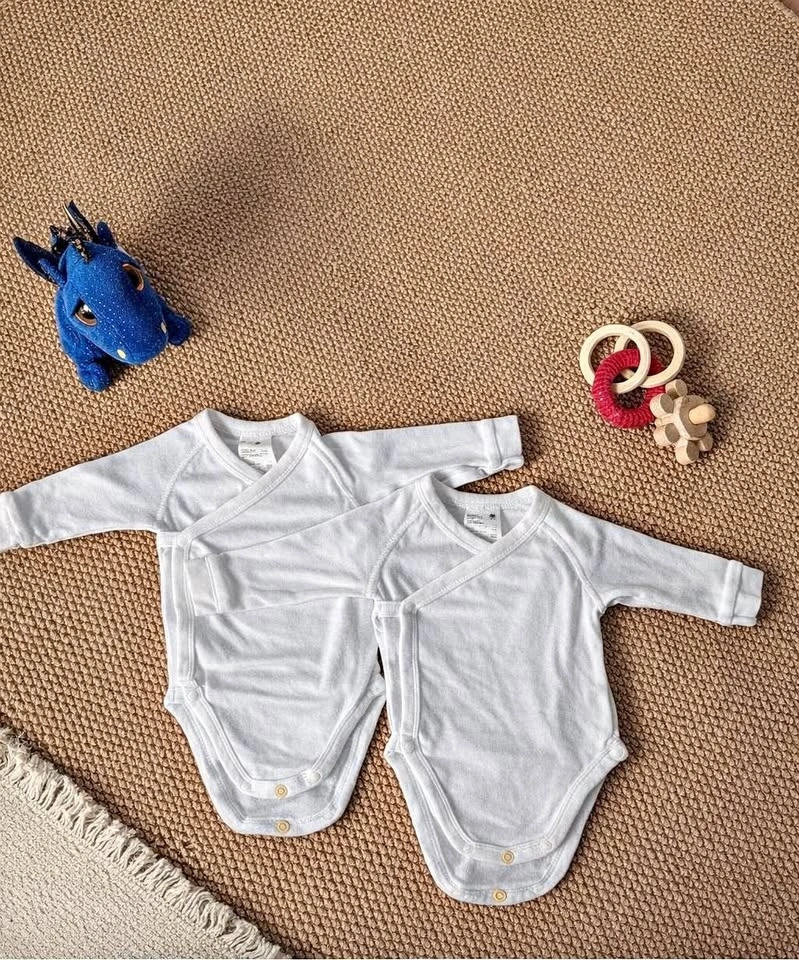 Selling 2 rarely used Uniqlo baby crossover bodysuits in white, size 3–6 months. These are great basics for layering, sleepwear, under sweaters or sleep sacks, and easy everyday changes. Details: Uniqlo Baby, Size 3–6M, 100% cotton, long sleeve, crossover / side snap style. Soft and simple baby essentials.