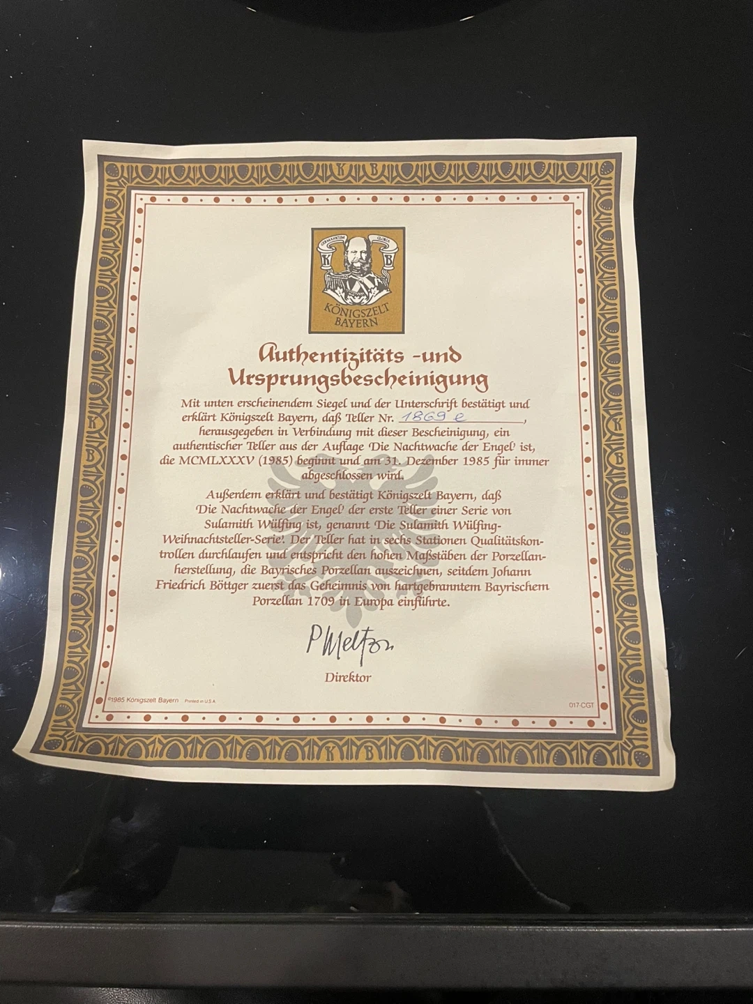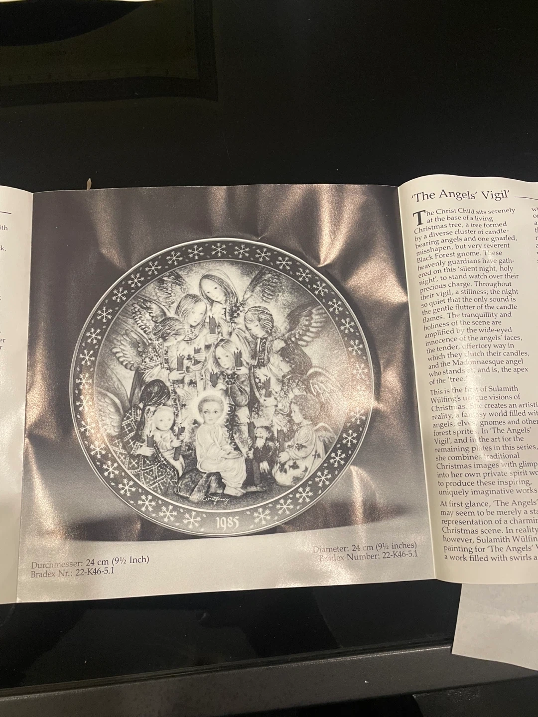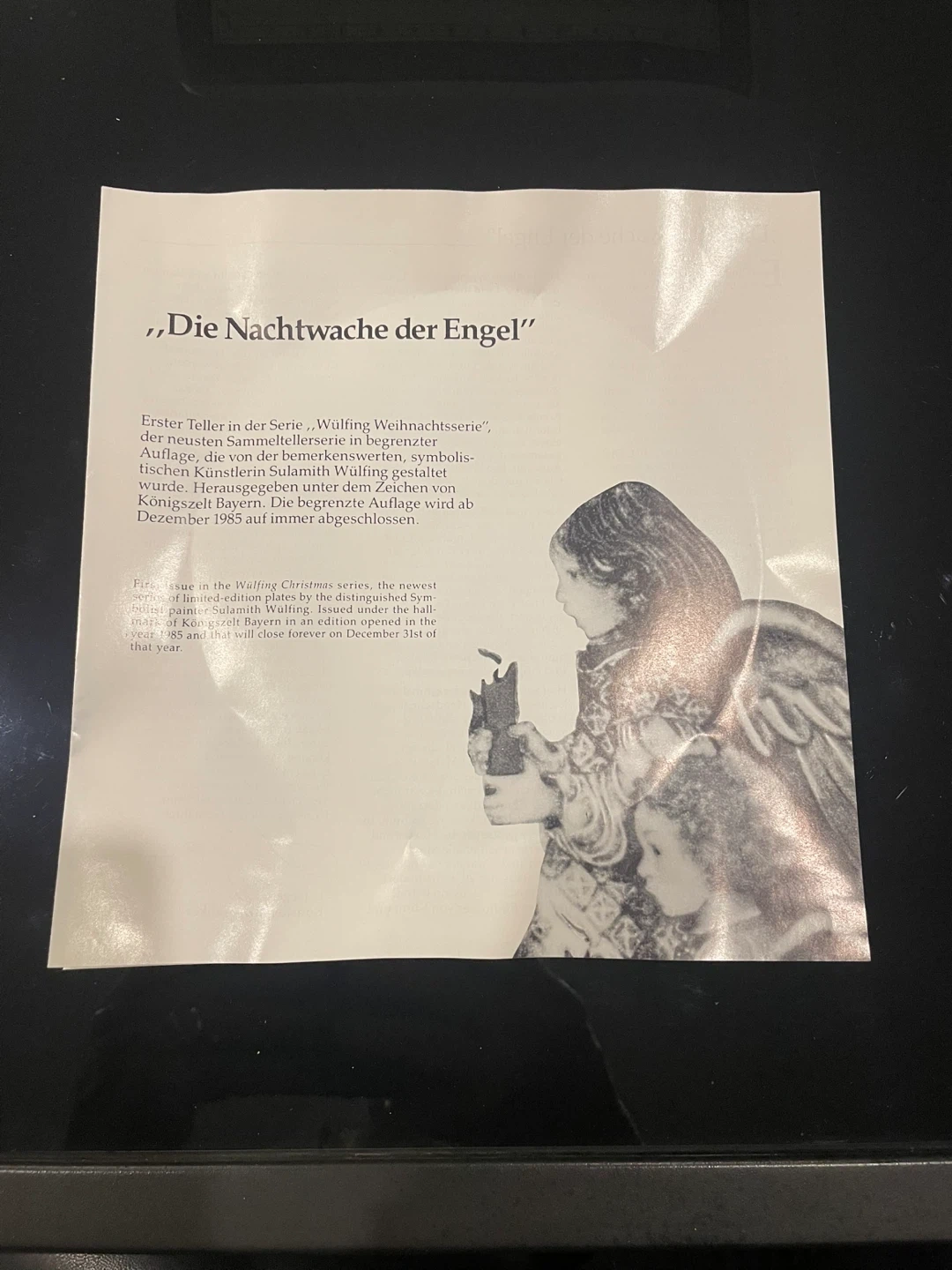 This is the first plate in the "Sulaminh Wulfing Christmas Series," titled "The Angels' Vigil." It's a limited edition collector plate made in 1985. The plate has a diameter of 24 cm (9.5 inches) and is made of fine Bavarian porcelain. It comes with its original authenticity certificate.