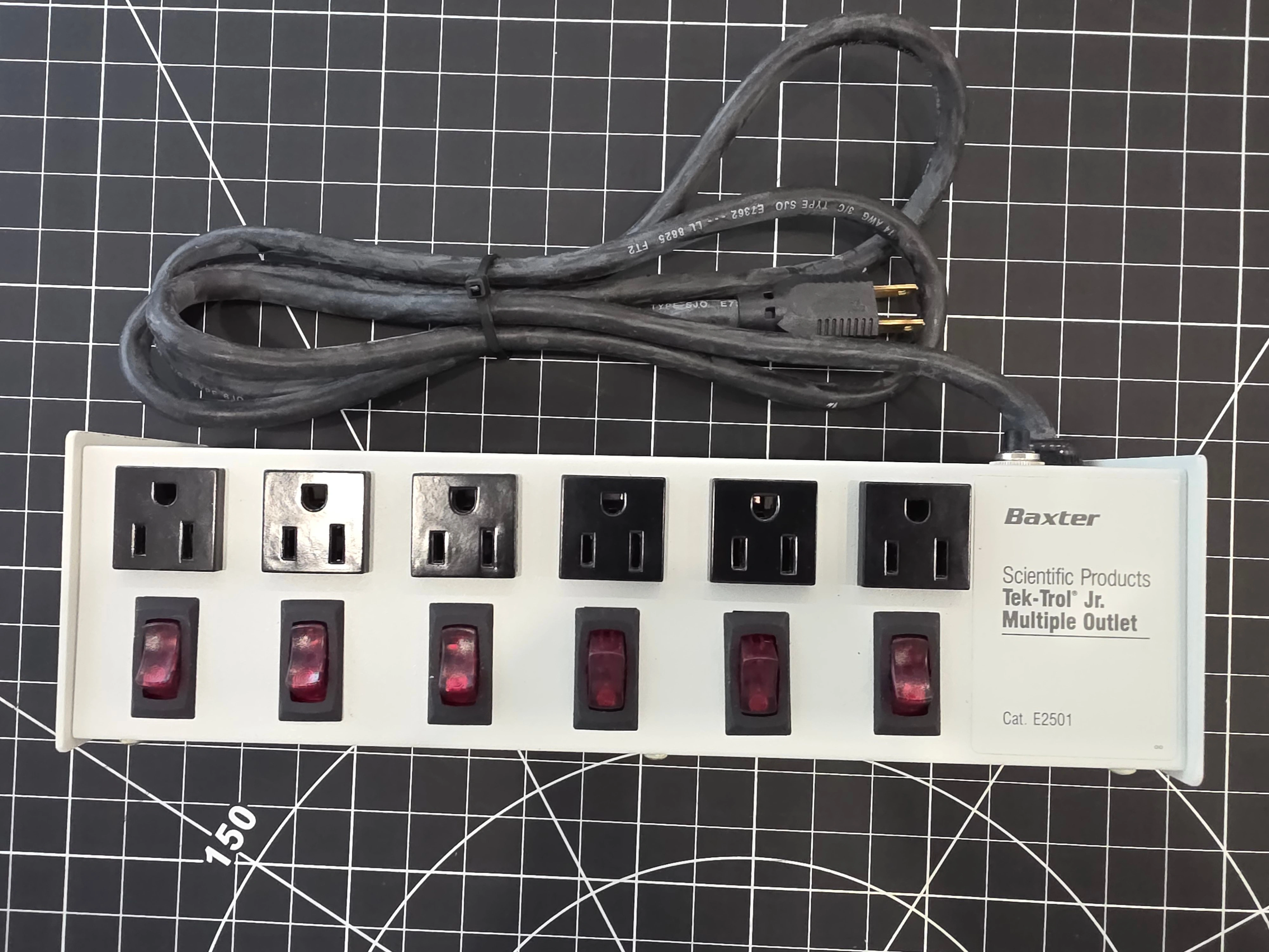 Baxter Scientific Tek‑Trol Jr. 6‑outlet power strip with individual on/off switches for each outlet. Ideal for workshops, labs, electronics benches, 3D printing setups, or any environment where controlled power is essential. Features: • 6 individually switched outlets • Heavy‑duty construction • Grounded 3‑prong plug • Perfect for tools, equipment, or lab use