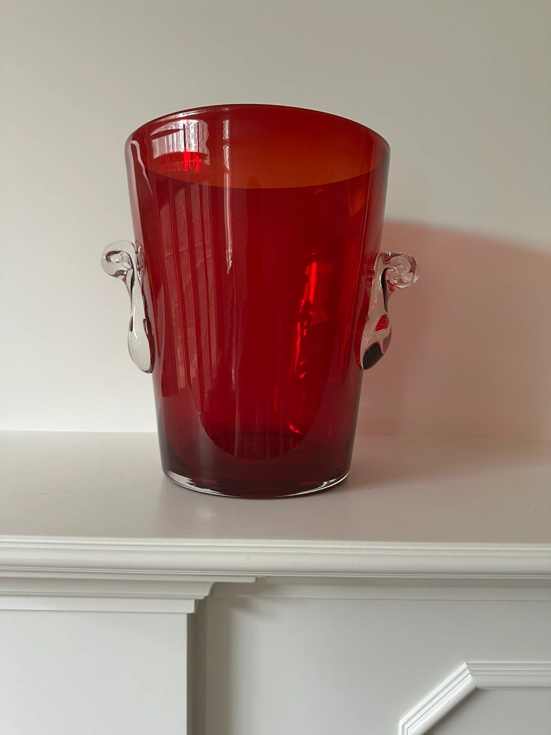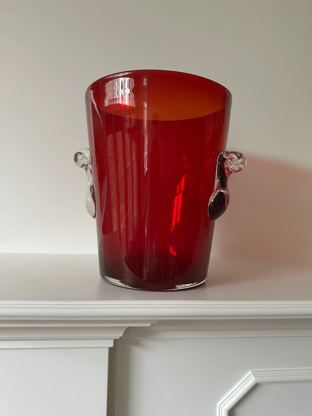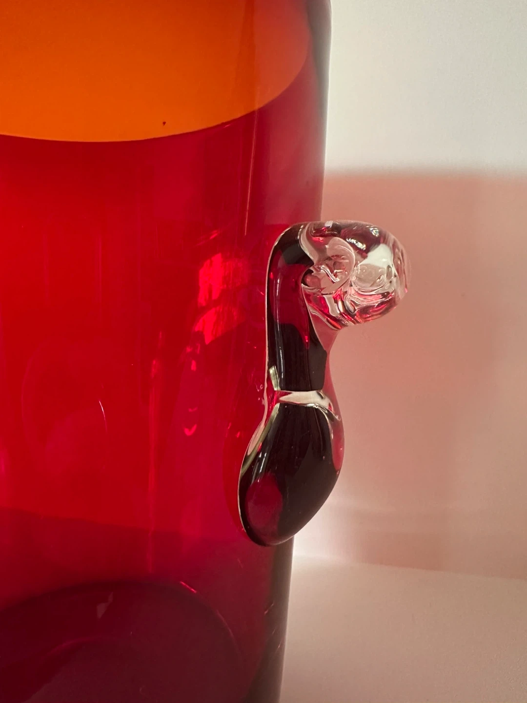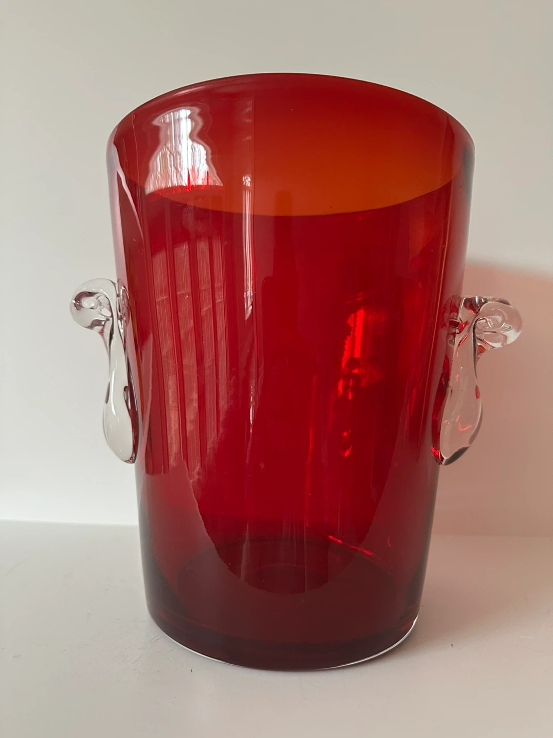 Italian Murano Hand Blown Glass Wine Ice Bucket 9” featuring two clear glass handles. Approximately 9” inches tall. Adds a pop of colour to any space!