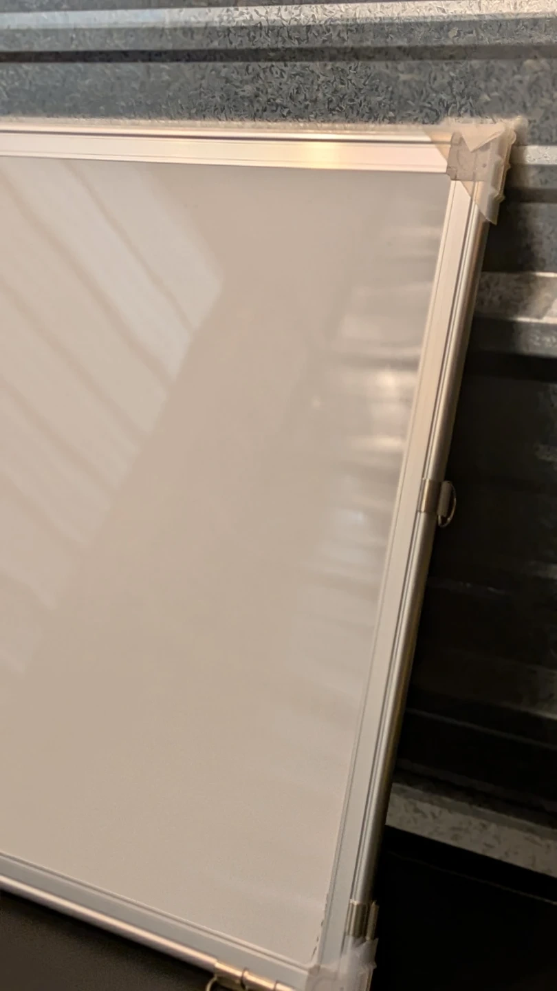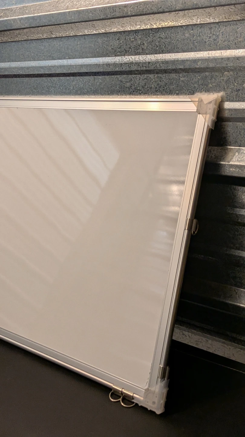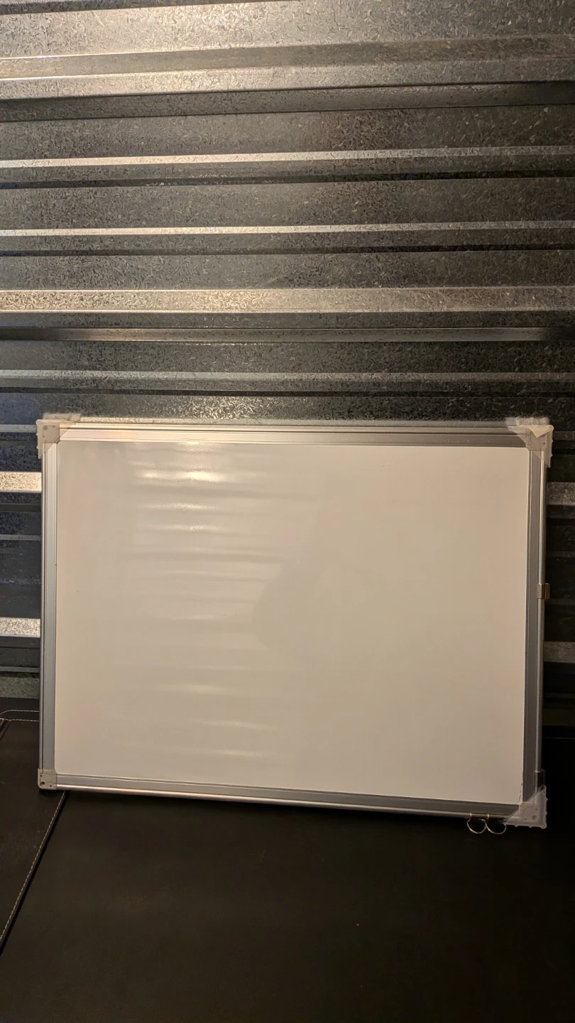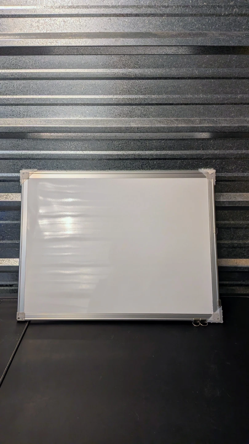 This is a standard whiteboard with an aluminum frame. It's great for jotting down notes or ideas. The surface is smooth and easy to write on.