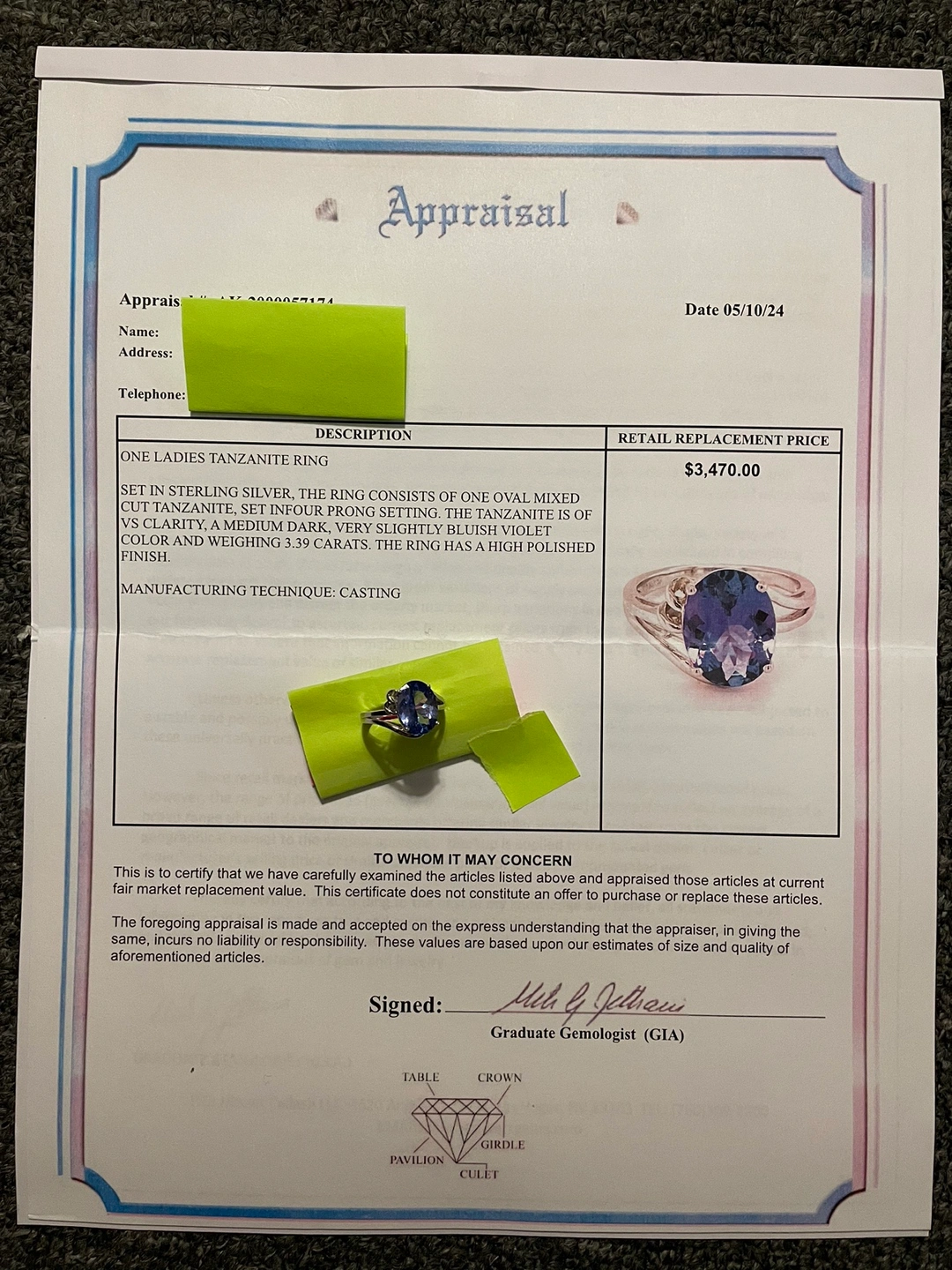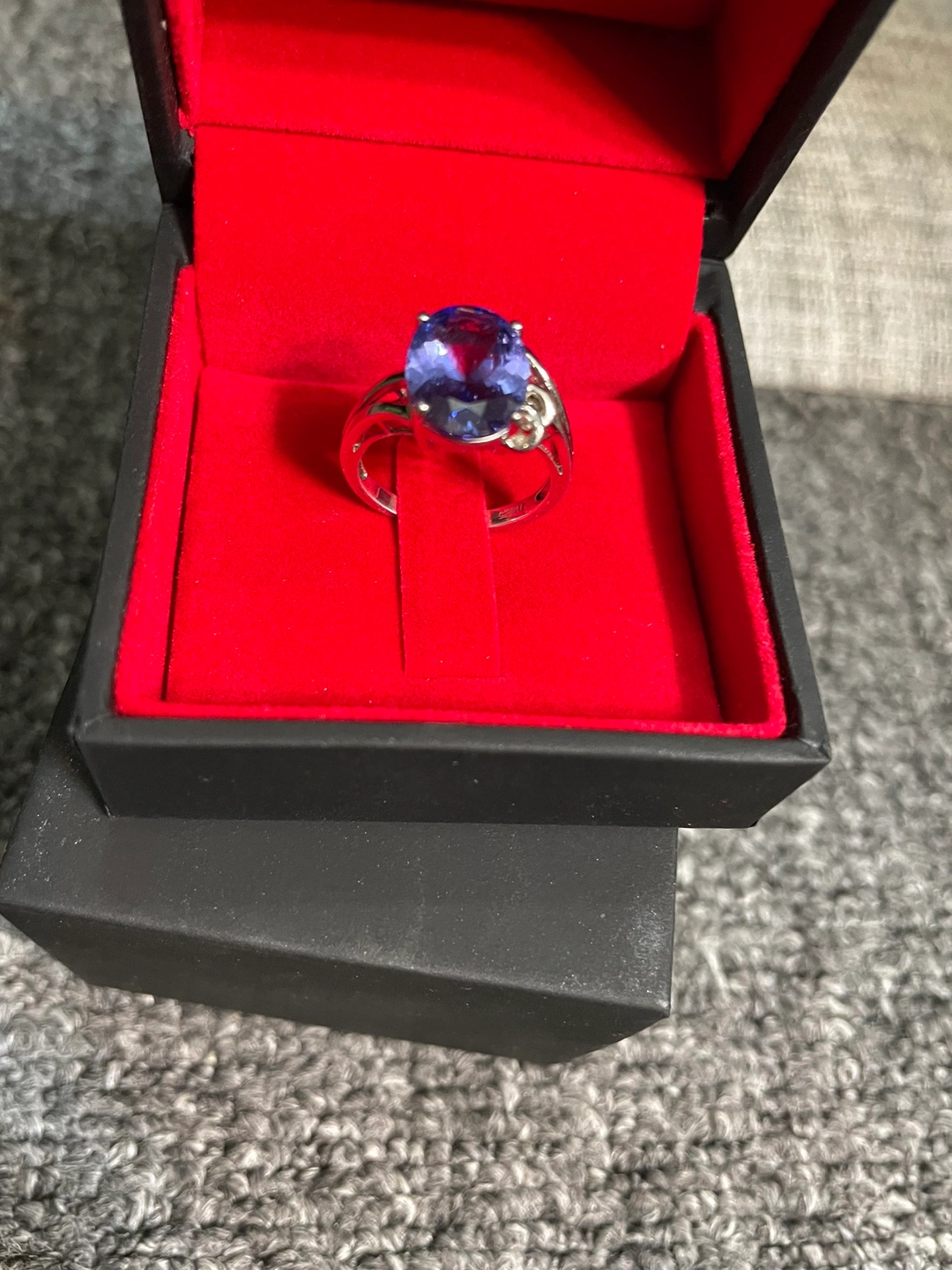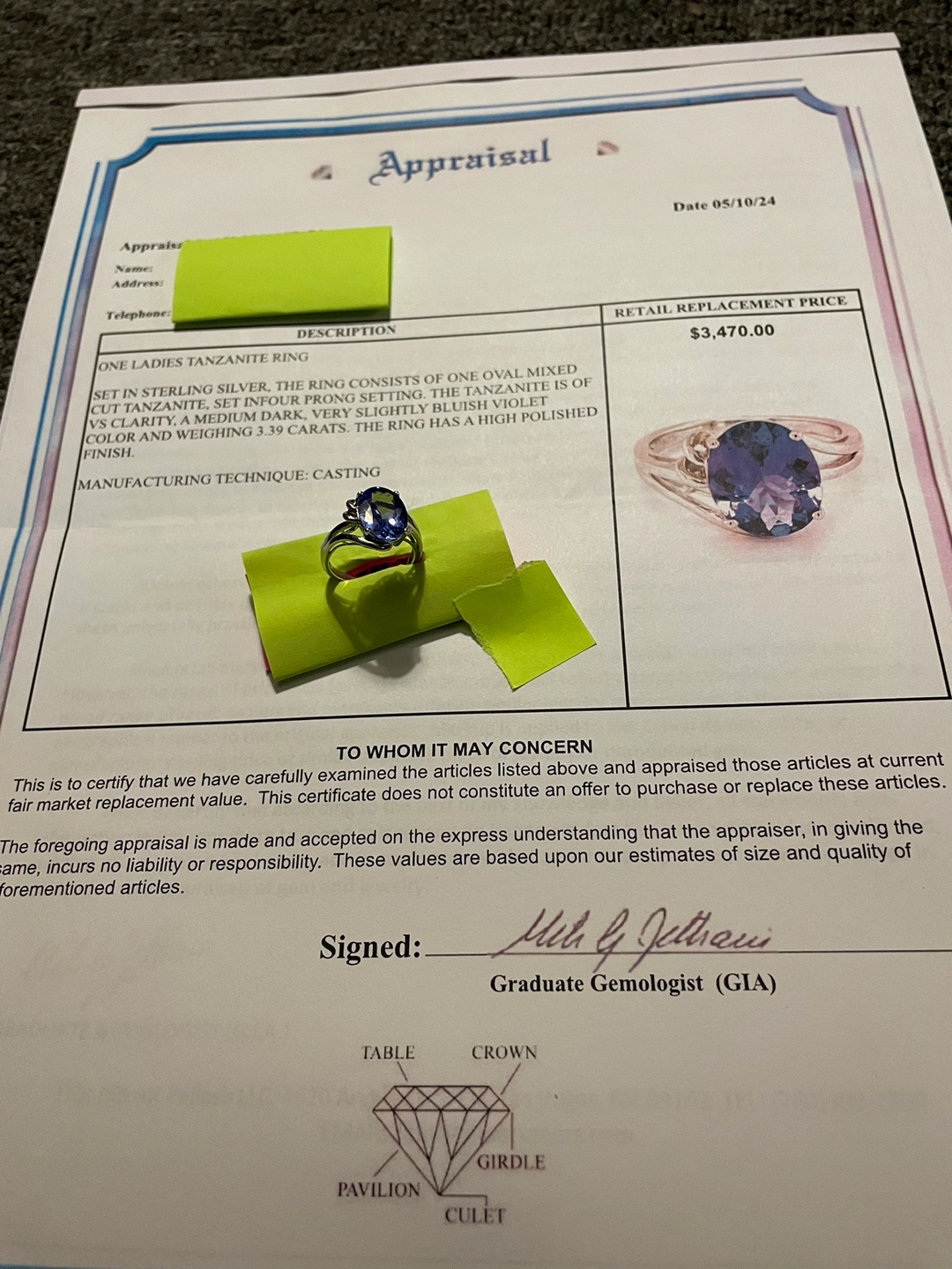 3.39 ct Natural Tanzanite on Sterling Silver Ring size 5.5. Is of VS clarity, a medium dark, very slightly bluish violet color. I just bought this ring this year as printed with the appraisal amount of $3,470 US dollars. Selling it for $3,300 CAD