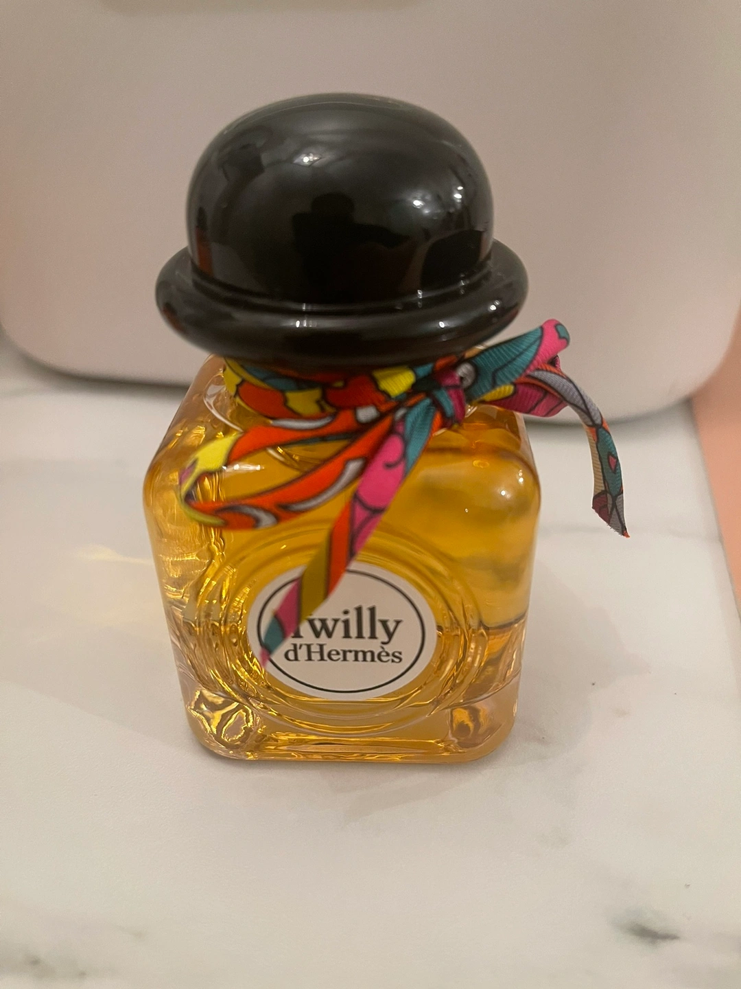 Twilly d'Hermes perfume with a black lid and a colourful ribbon.