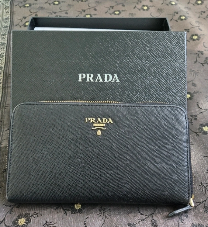 Selling a Prada wallet in black. It comes with its original box. It's in great condition and ready for a new home!