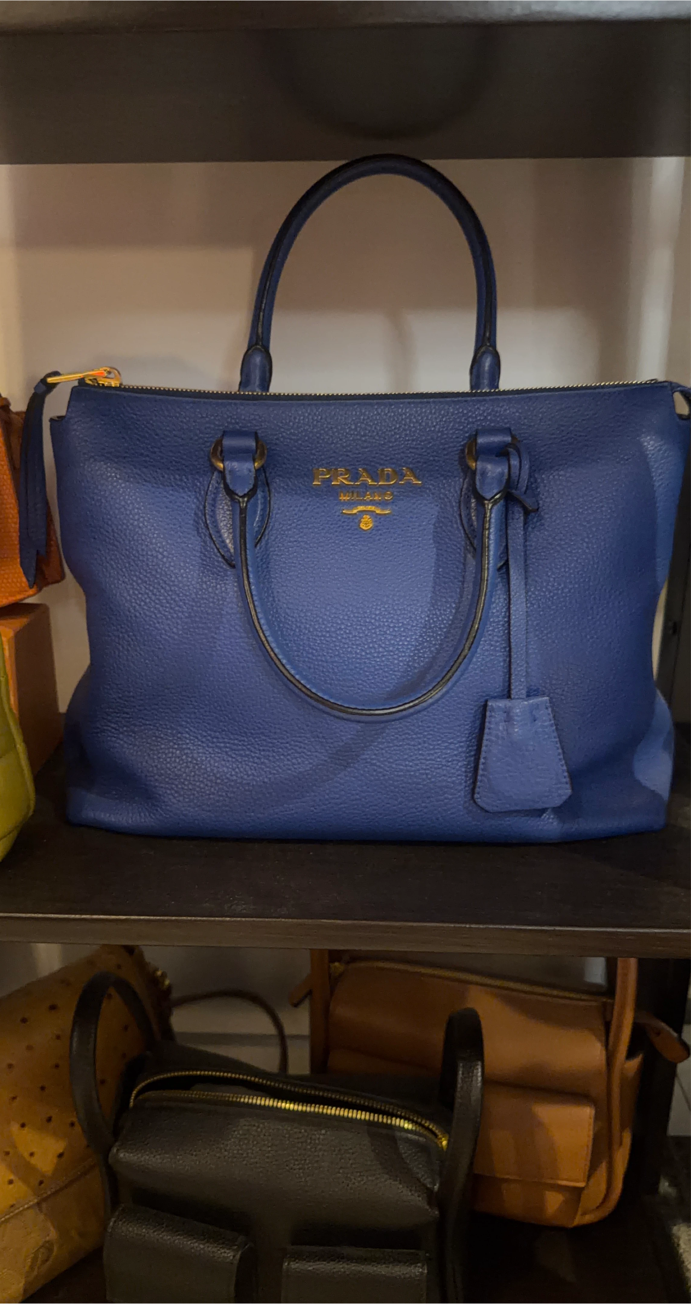 60A beautiful blue leather handbag from Prada! It's in great condition and ready for a new home. The leather has a lovely texture, and the colour is a striking blue.