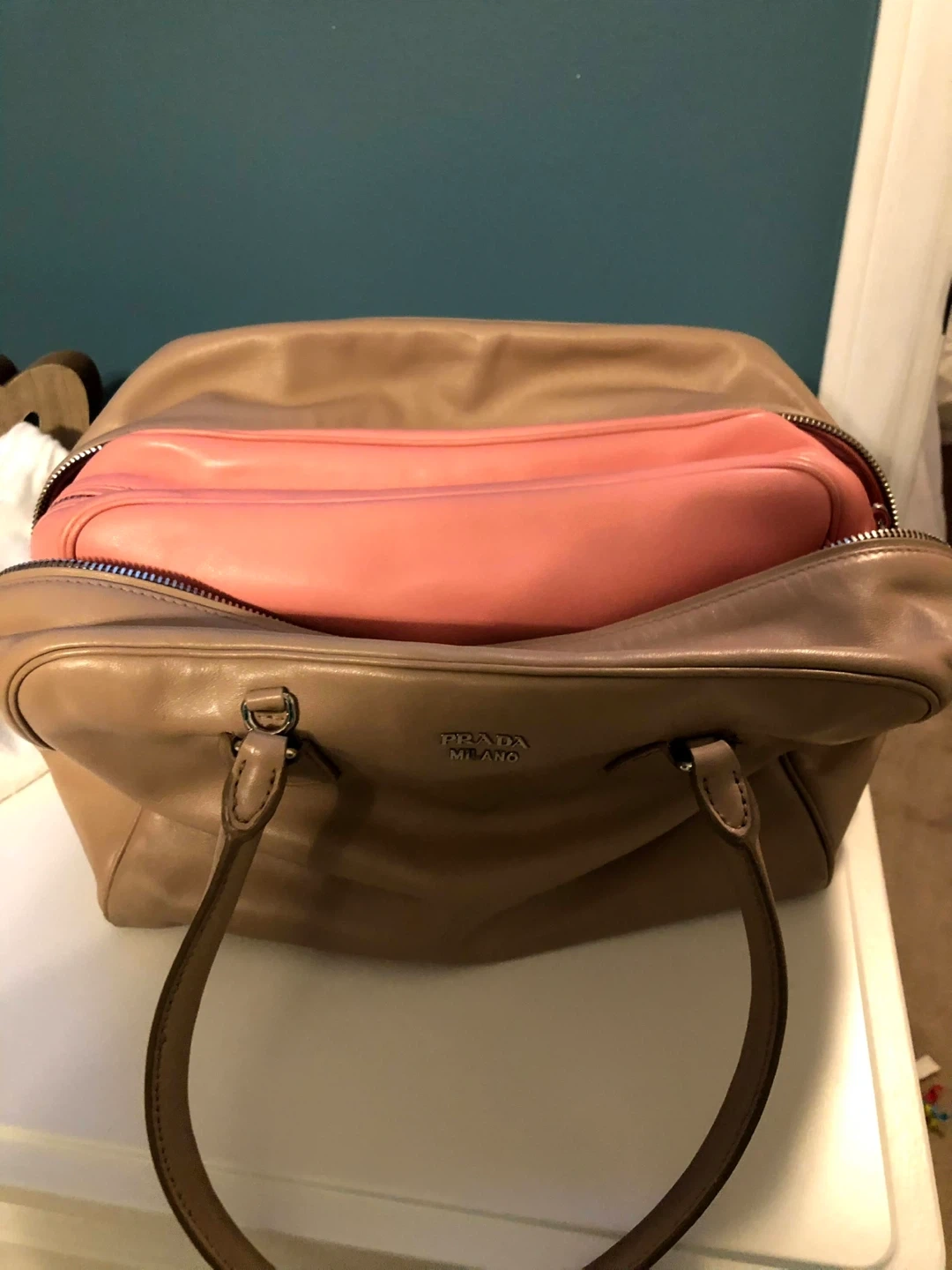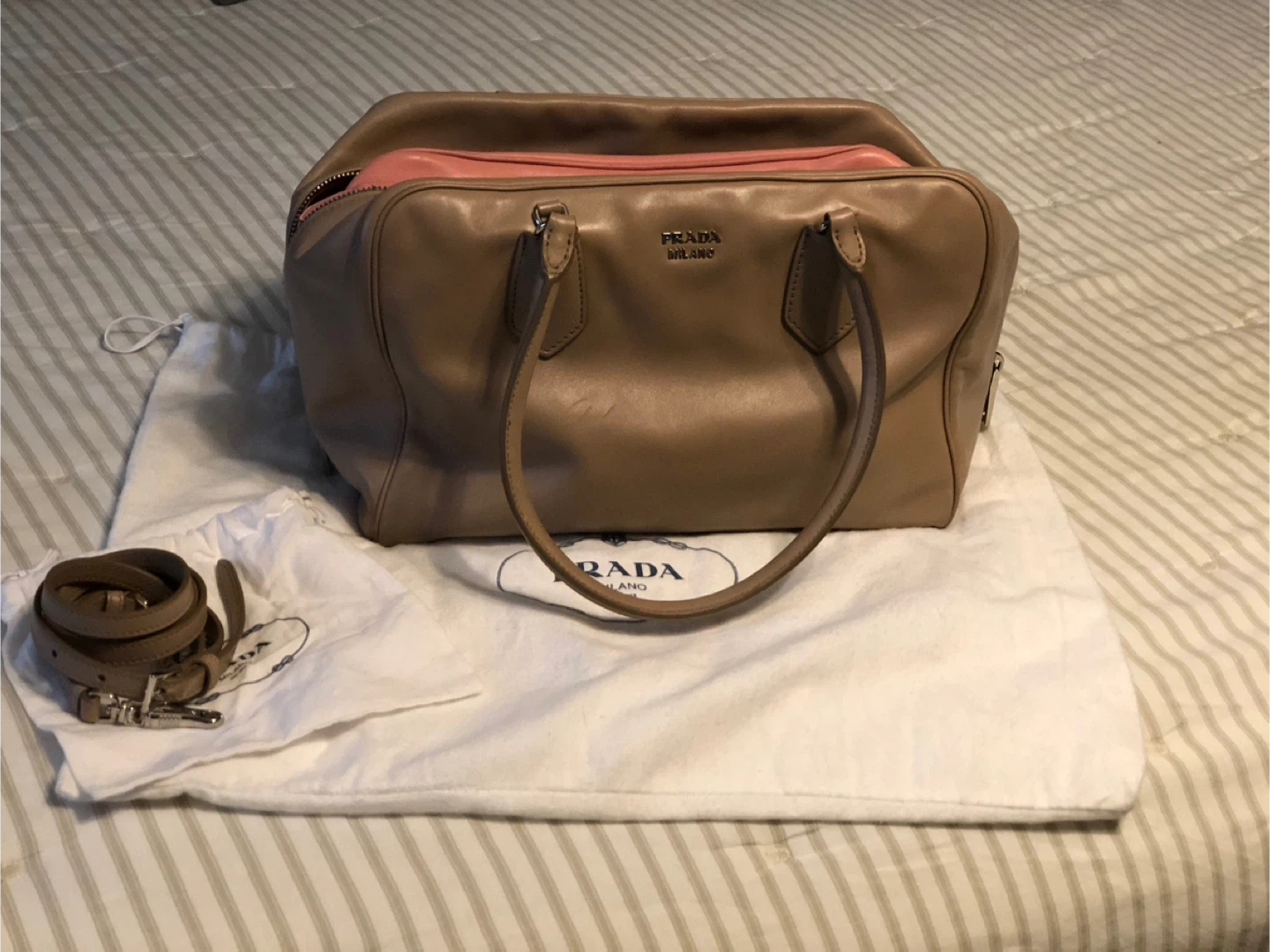 56This is a Prada Milano leather satchel bag in a lovely neutral colour. It comes with its dust bag and an additional strap. It's in great condition and ready for a new home!