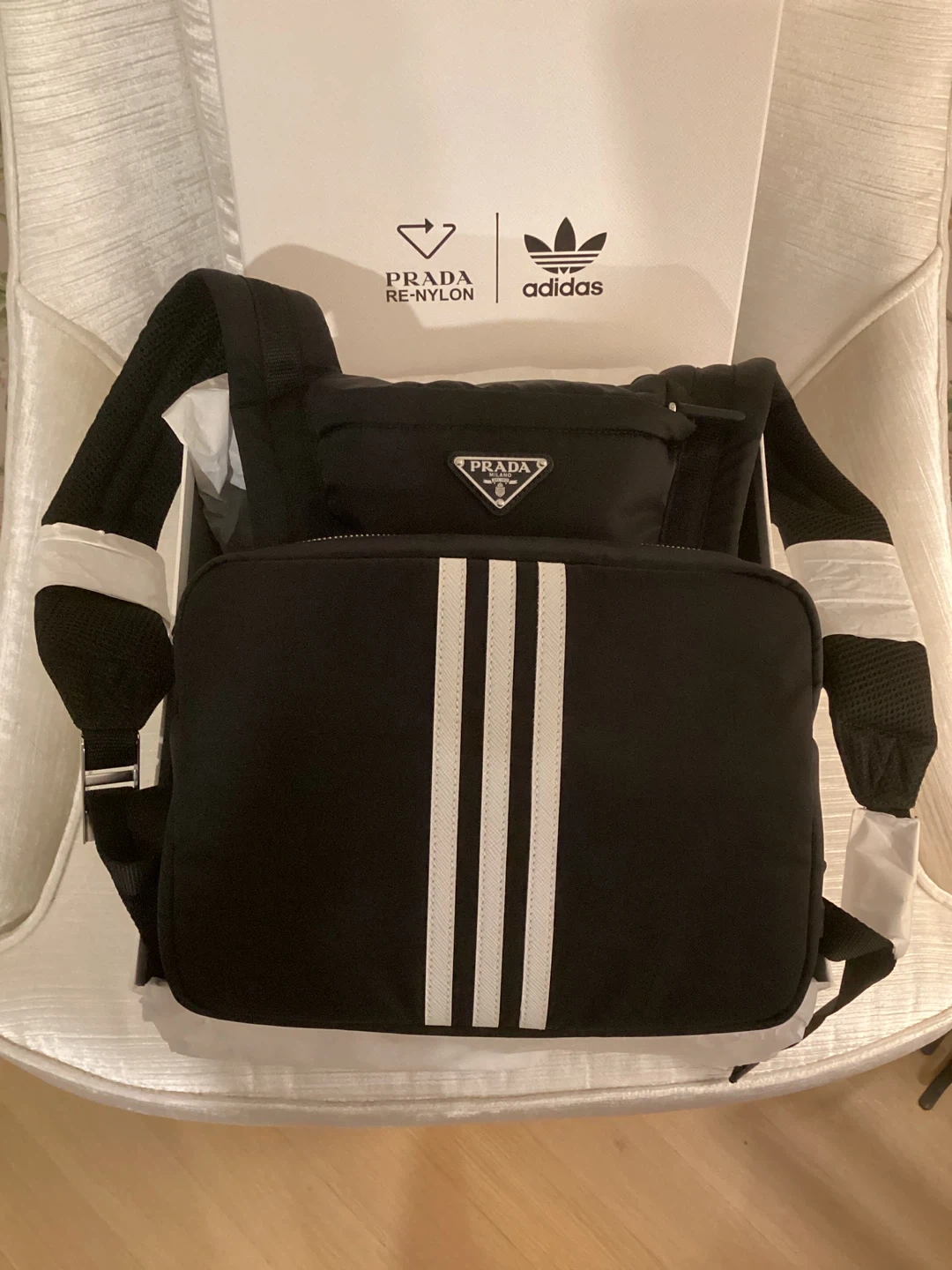60Selling a Prada Re-Nylon Adidas backpack in black! It's new and comes with the original box. This stylish backpack is a collaboration between Prada and Adidas, featuring the iconic three stripes. Perfect for everyday use or travel!