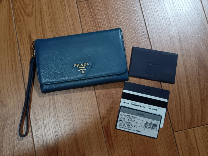 Selling a Prada Saffiano Leather wallet in blue colour! It's in great condition and comes with its original cards. 10000% authenic. There are wear and tear but still has a ton of life in it, therefore the price.