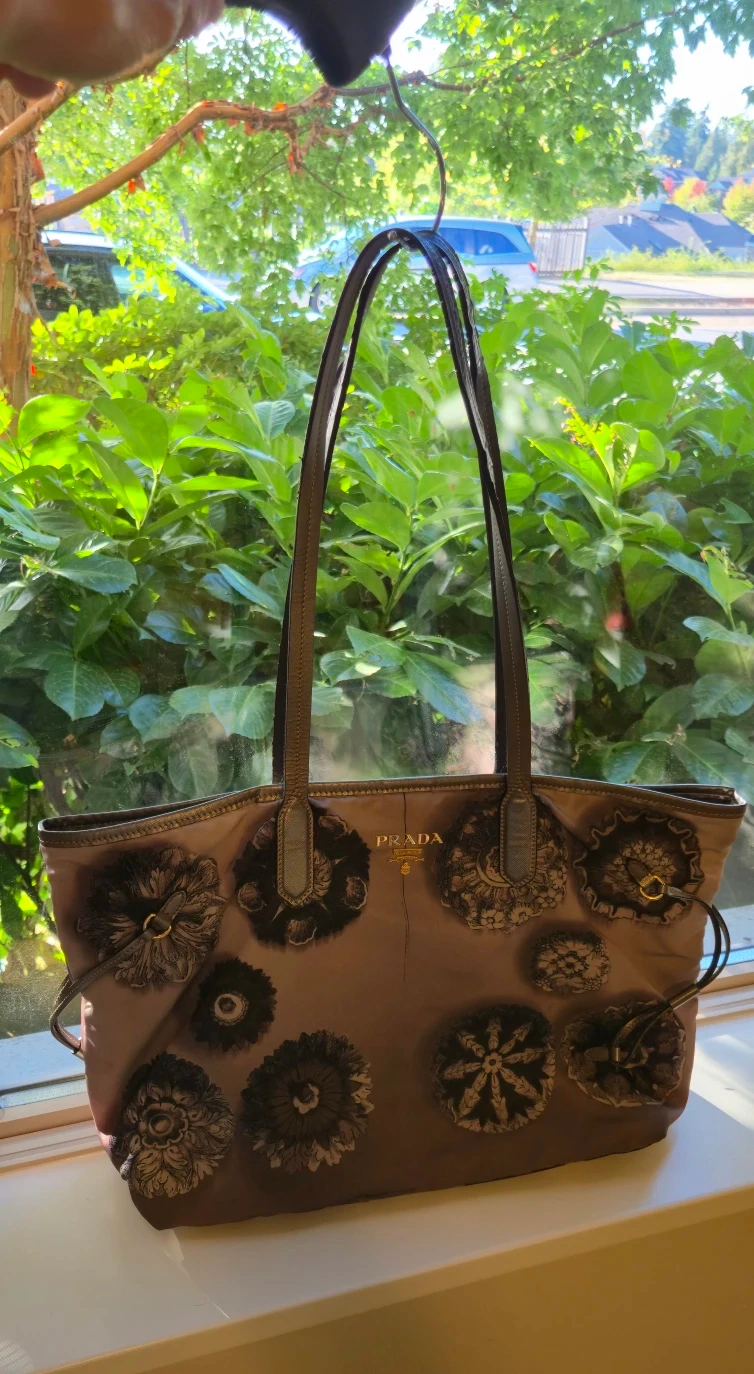 17Prada bag with a unique floral pattern. The bag features a spacious interior with a zipper pocket. It's perfect for everyday use or as a stylish accessory for any outfit!