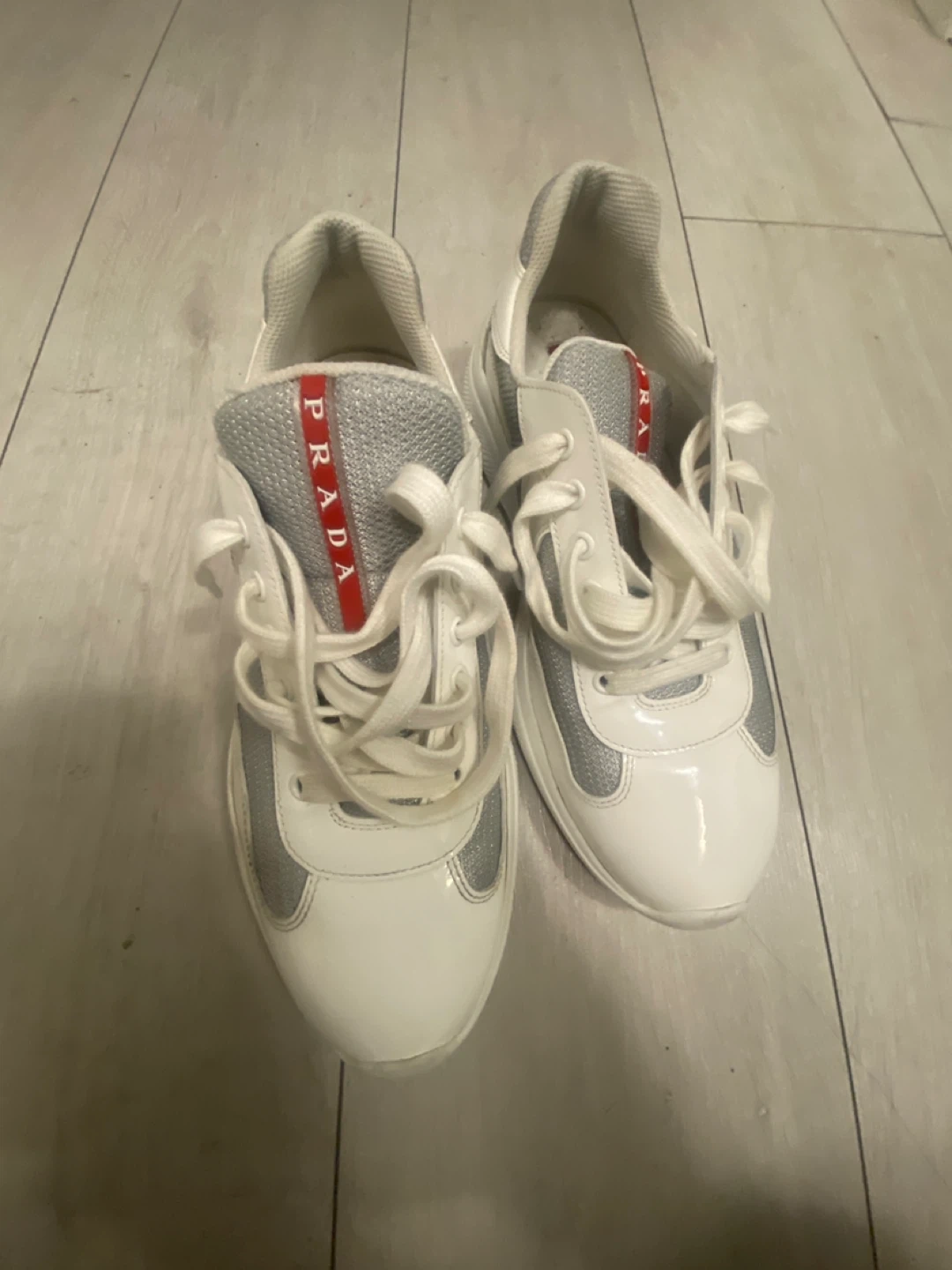 Selling a pair of Prada sneakers in white and silver! They feature the Prada logo in red. Great for adding a touch of luxury to your everyday style
