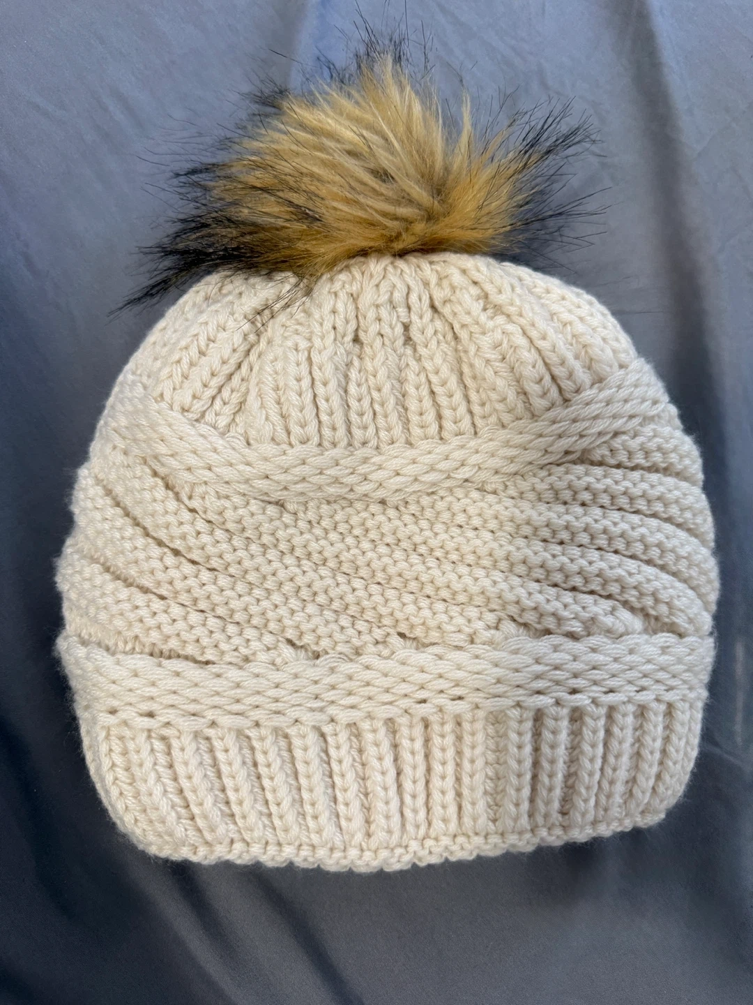 A cosy cream-coloured knit beanie. It has a ribbed cuff and a fuzzy pom pom on top.