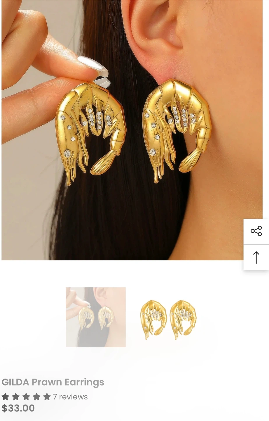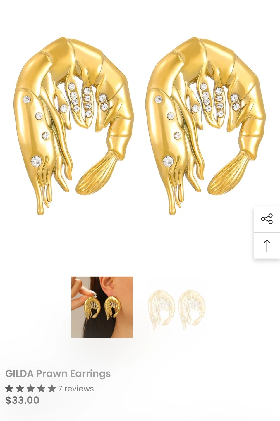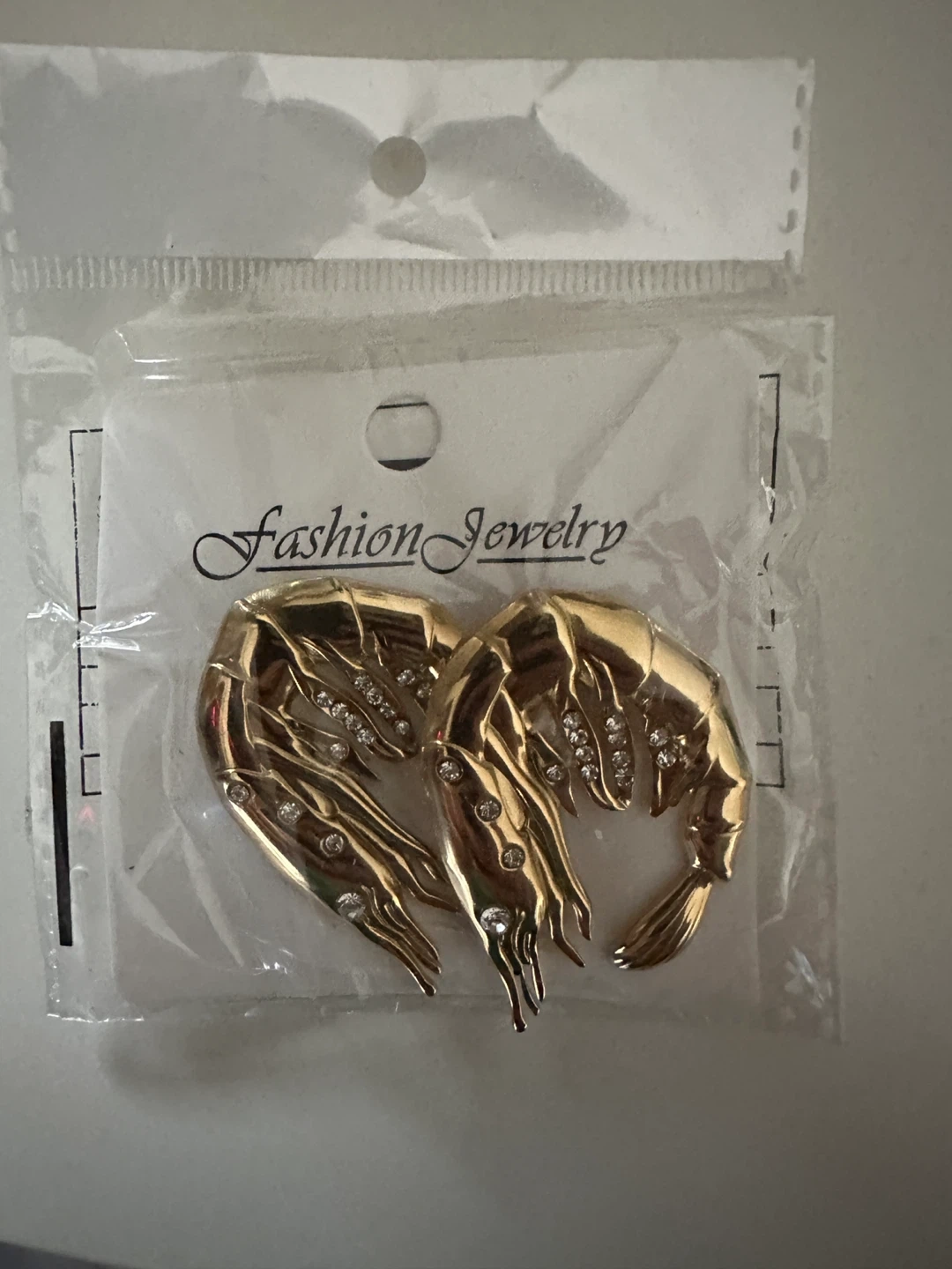 15prawn earrings, a unique piece of fashion jewelry! They are gold in colour and feature some sparkly stones. They are brand new and come in their original packaging. They retail for $33