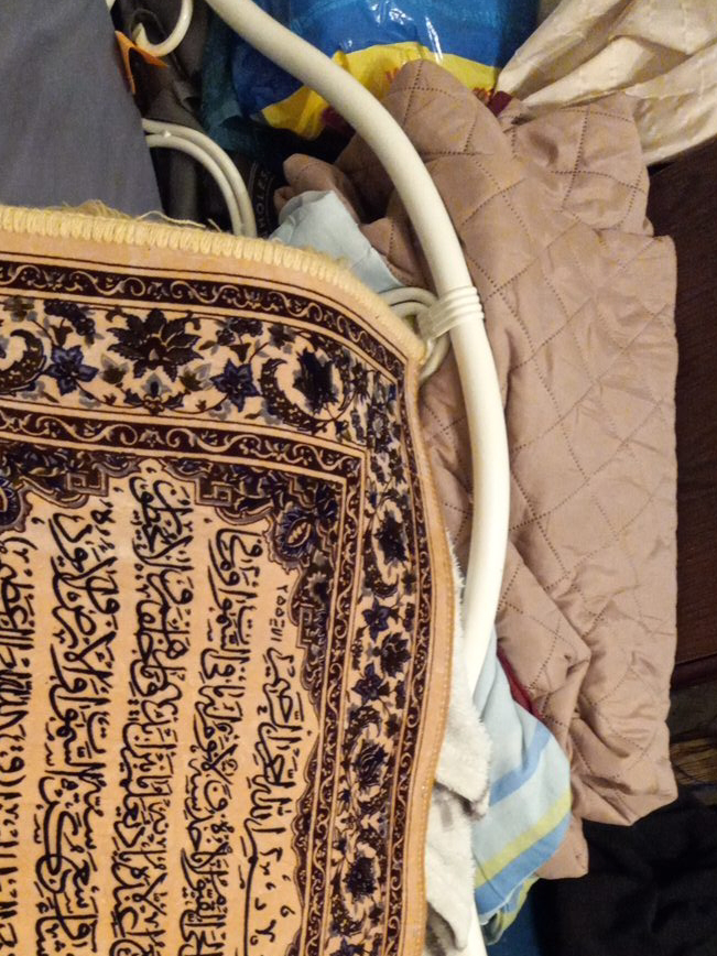 Prayer rug with Arabic calligraphy and floral design. It's in good condition and ready for a new home!