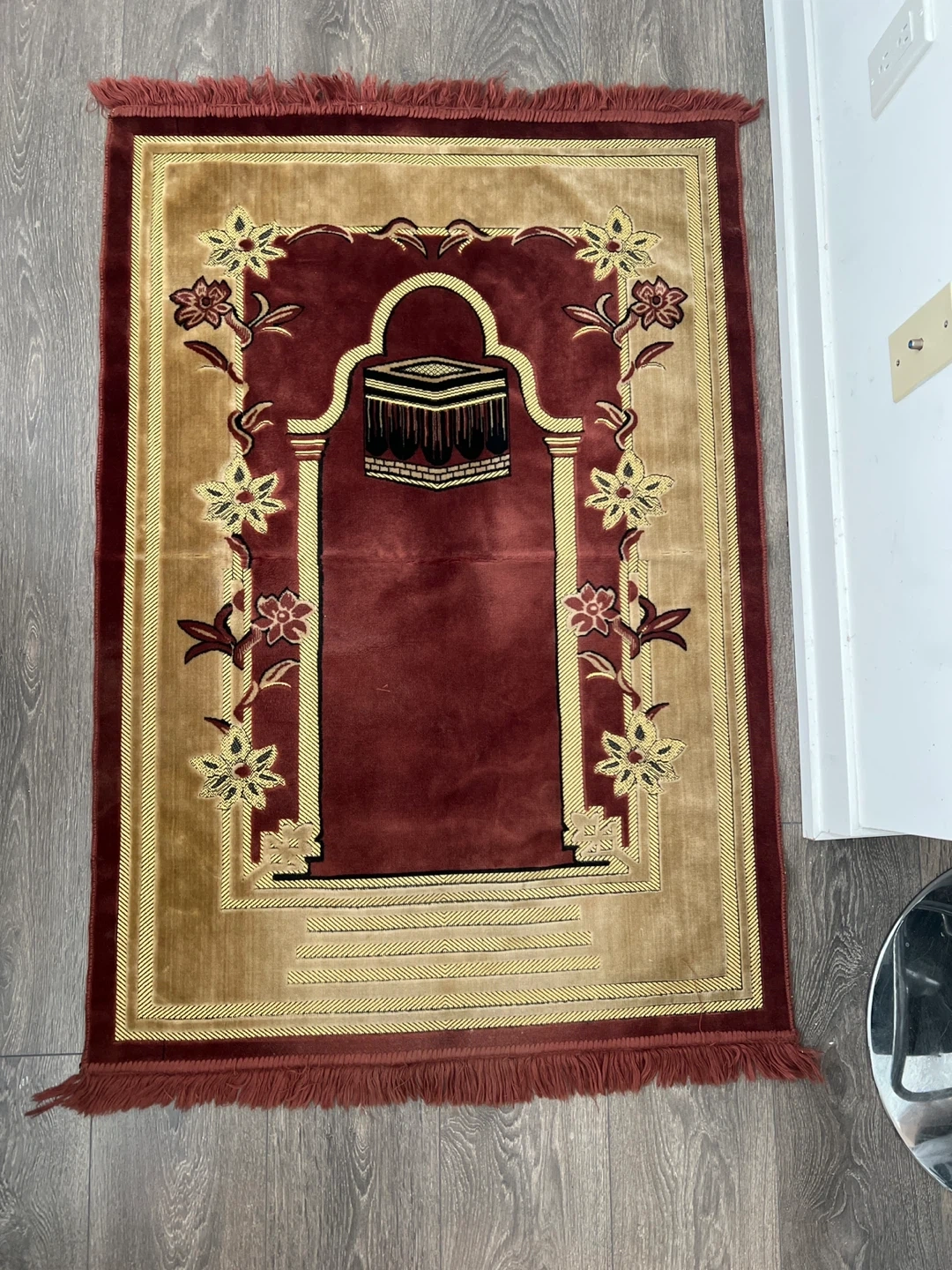 79Prayer rug featuring a burgundy and gold design with floral accents It's in great condition and ready for a new home