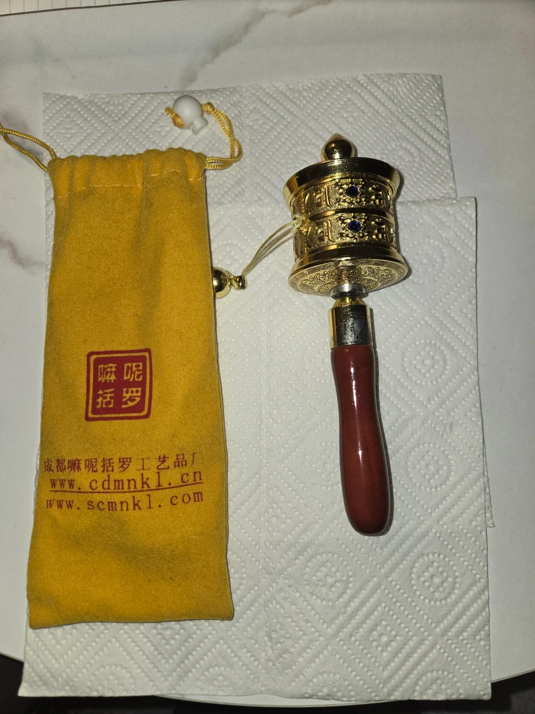 207Selling a prayer wheel that comes with a yellow carrying pouch. The pouch has some Chinese characters on it, including the company name "Chengdu Mane Kora Crafts Factory."