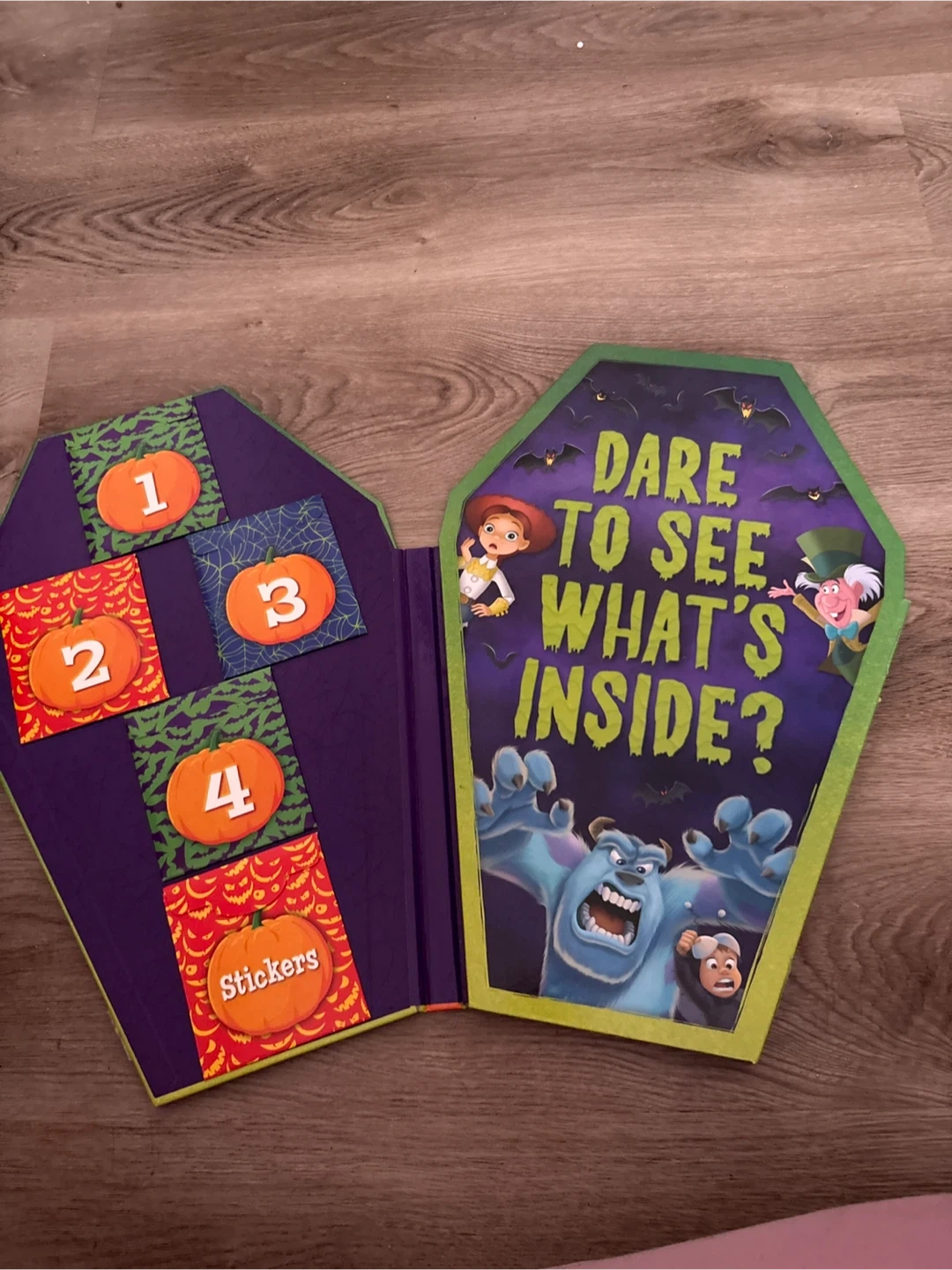 This Disney Halloween Countdown Library includes 13 spooky books inside a coffin-shaped box. It also comes with over 80 glow-in-the-dark stickers. Perfect for little ones counting down to Halloween!