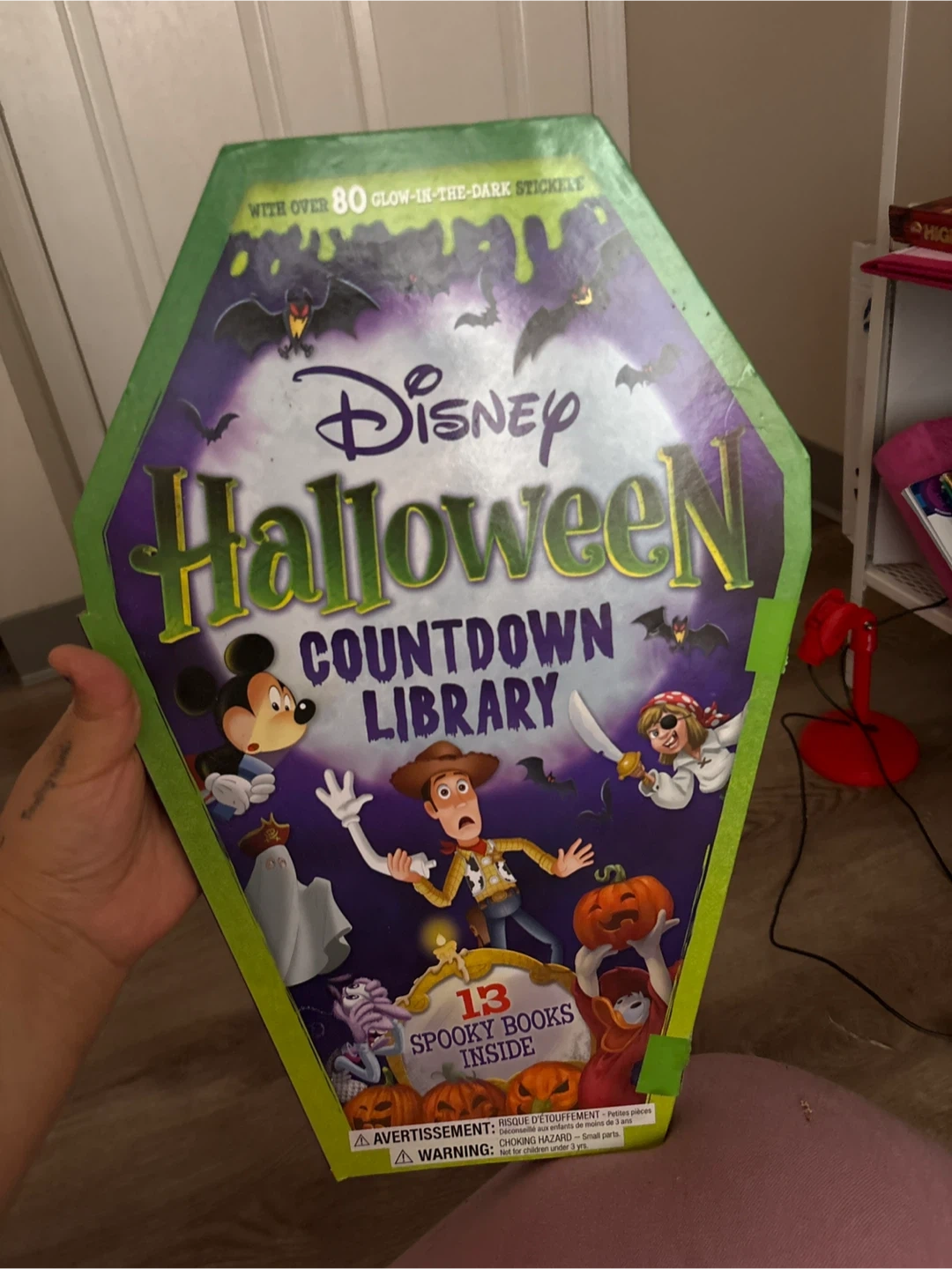 This Disney Halloween Countdown Library includes 13 spooky books inside a coffin-shaped box. It also comes with over 80 glow-in-the-dark stickers. Perfect for little ones counting down to Halloween!