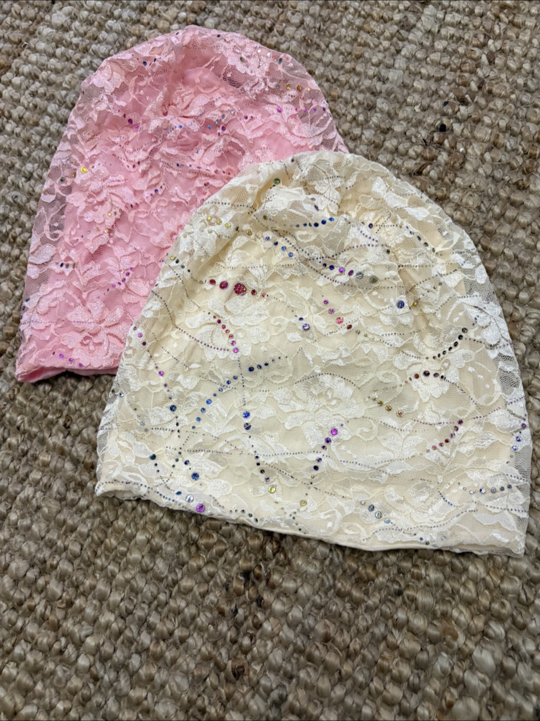 Selling these cute lace beanie hats! One is a pretty pink, and the other is a lovely cream colour. Perfect for adding a touch of sparkle to your outfit!