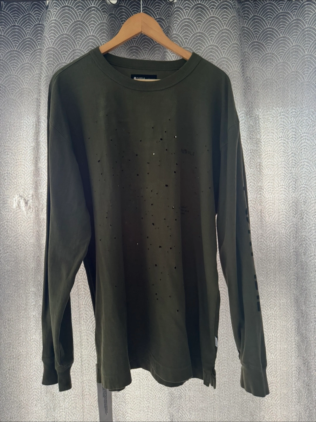 Olive green long sleeve shirt. Features an eagle graphic on the back. Distressed detailing throughout. Long sleeves and crew neck. Size and material not specified.