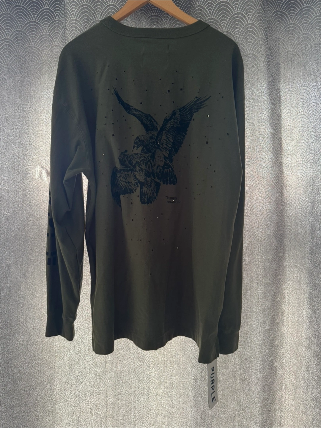 Olive green long sleeve shirt. Features an eagle graphic on the back. Distressed detailing throughout. Long sleeves and crew neck. Size and material not specified.