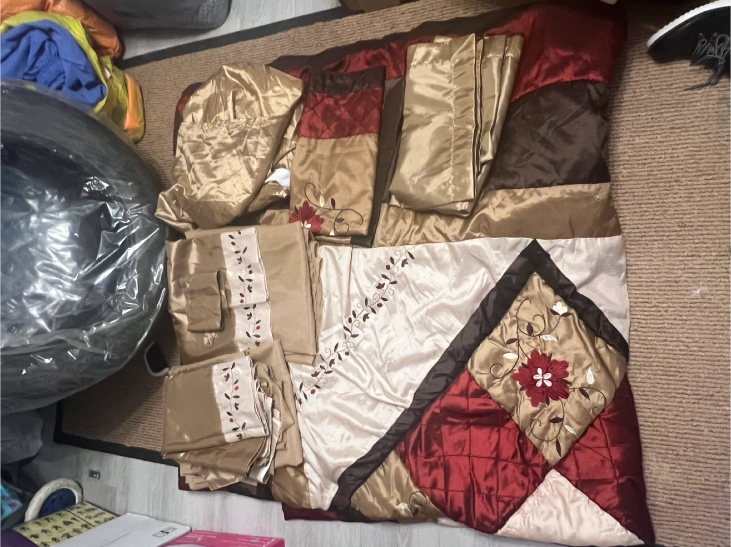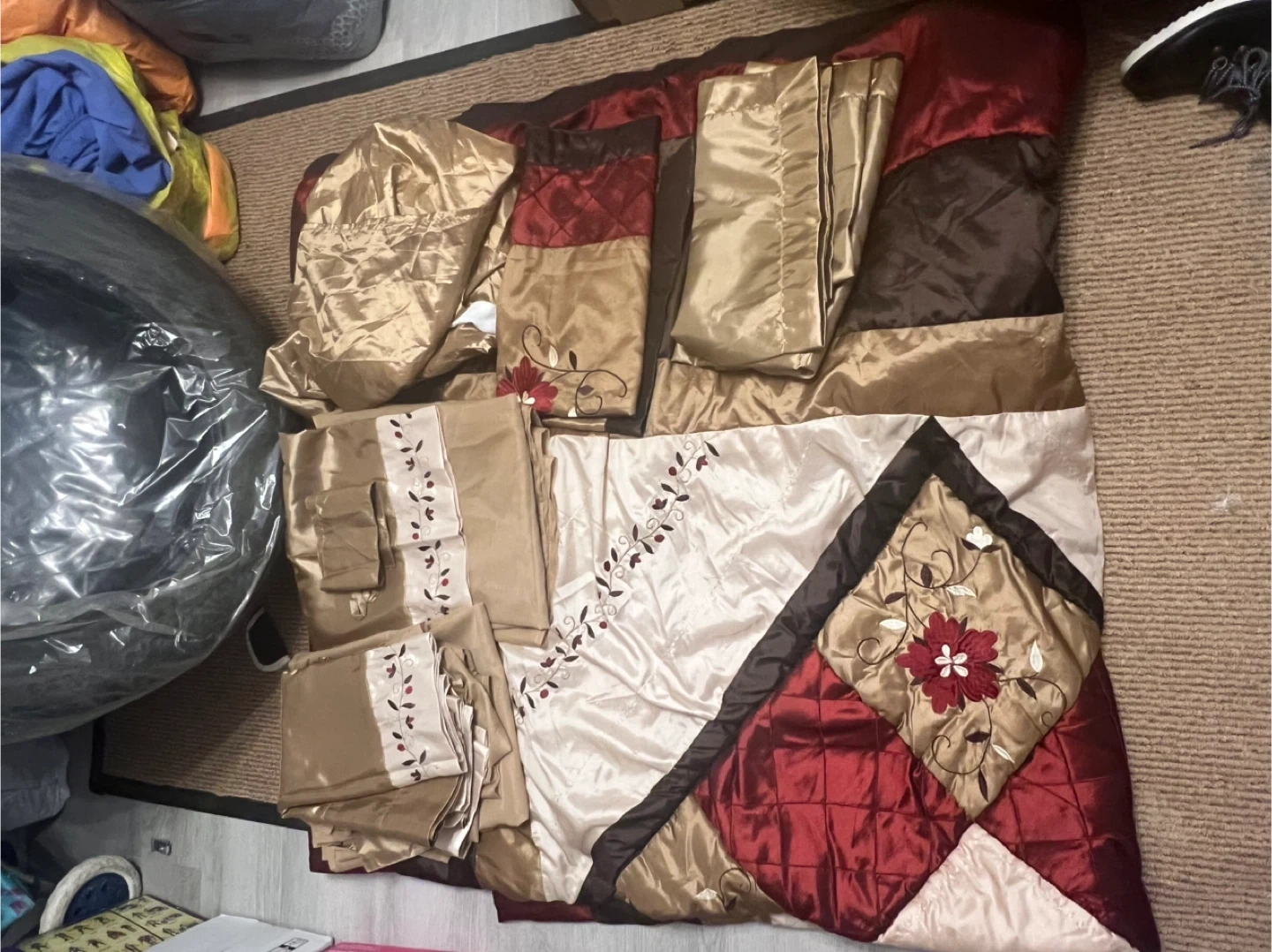 Beautifully patterned bedding set with floral embroidery. Includes multiple decorative pillow shams and duvet cover or comforter. Included panels of curtains for bedroom. Adds a touch of elegance to any bedroom. Fabric feels like satin or silk blend.