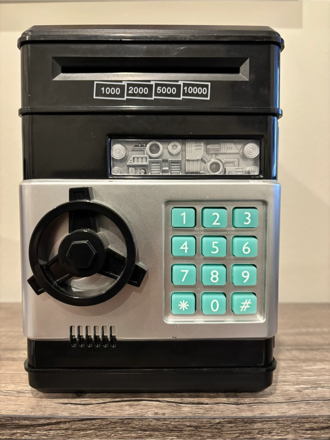 This electronic piggy bank features a keypad for secure access. It has a slot for bills and is designed to help kids save money. The safe has markings for 1000, 2000, 5000, and 10000, likely indicating different saving goals or compartments.
