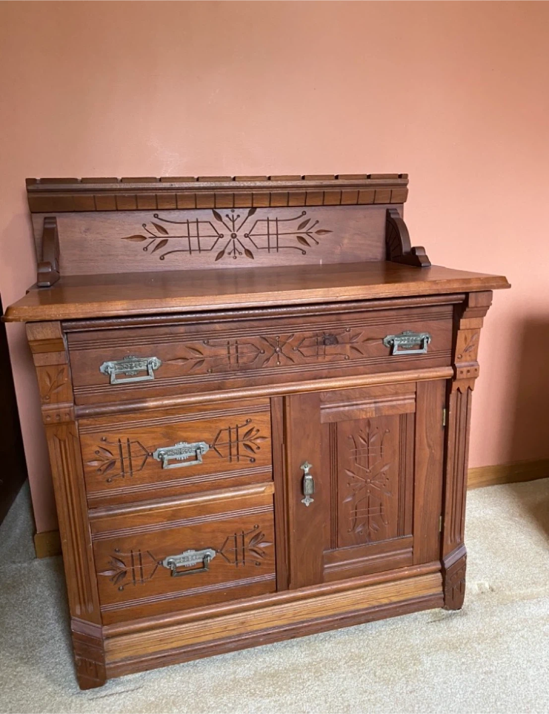 This antique wood sideboard cabinet features decorative carving and metal hardware. It has four drawers on the left and one door on the right for storage. The wood finish is a warm, rich brown.