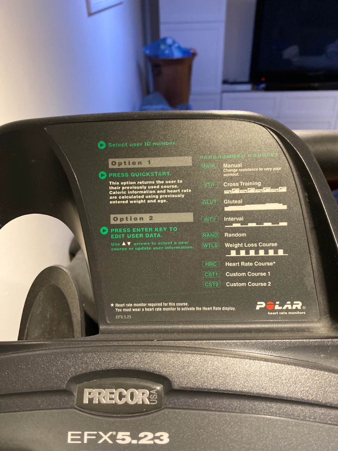 10Selling a Precor EFX 5.23 elliptical crosstrainer. It has a Polar heart rate monitor. Select user ID and customize your workout with various program courses like cross training, interval, and weight loss. Great for getting your cardio in at home!