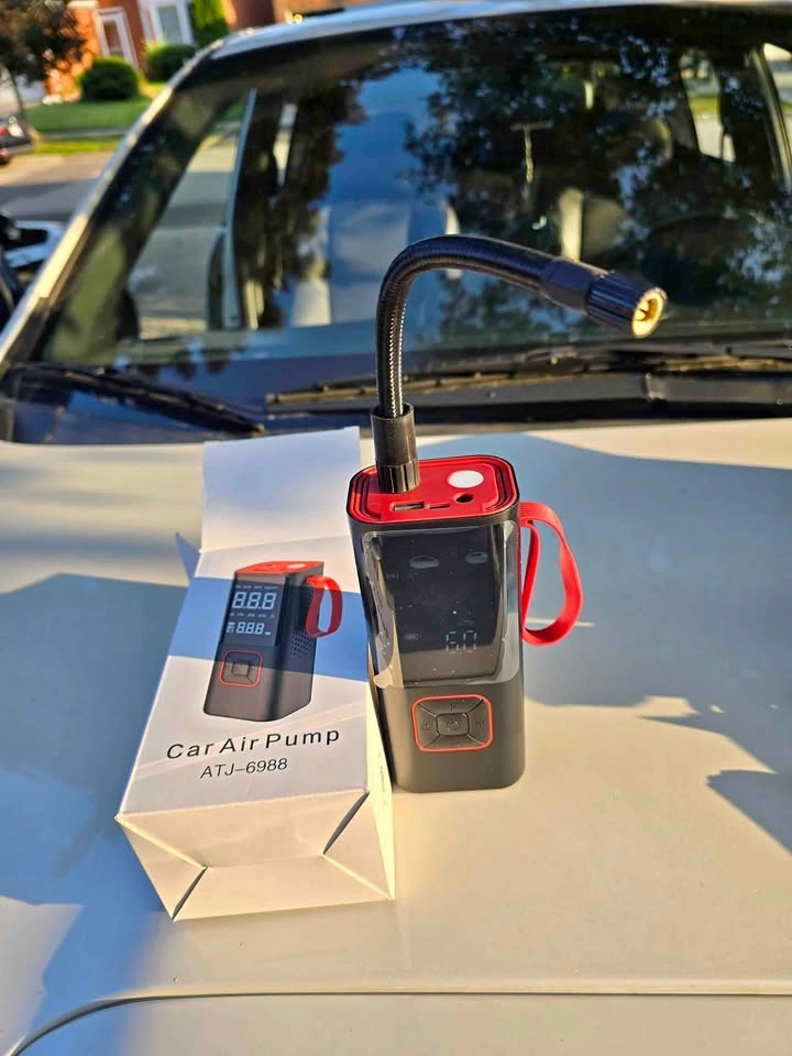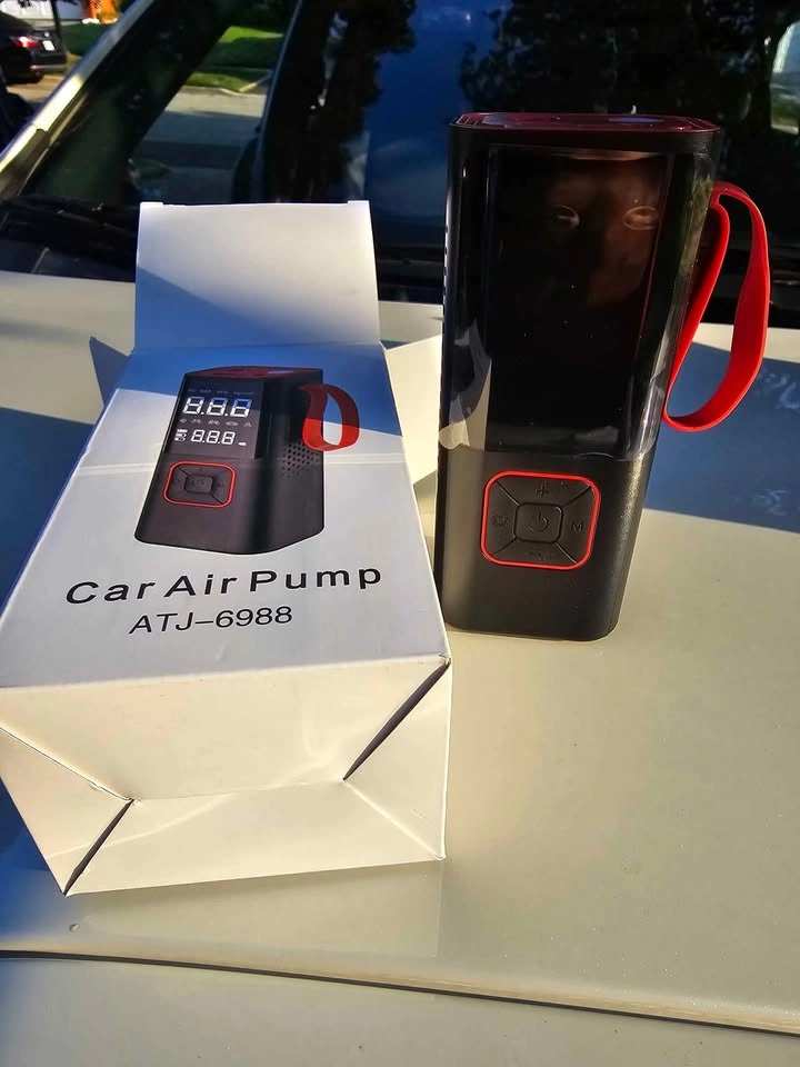 Brand new Tire Inflator Portable Air Compressor, 150PSI Rechargeable Air Pump for Car Tires with Digital Pressure Gauge & LED Light DC 12V Cable for Car Motorcycle Bike Ball Car Accessories Power source: Battery Powered Special feature: Portable, LED Light, Cordless/Corded, Digital, Automatic Shut-Off 3X Faster tire inflation & pocket size: Up to 150 PSI, the portable air compressor can fill a small car tire (29-36PSI, 195/65/R15) in just 1 minute, or fully inflate it in 6 minutes. Small and compact car air pump that fits in your glove box or trunk Cordless tire inflator & DC 12V Power Cord: Built-in 9000mAh rechargeable battery, fully charged can inflate 24 tires (29-36PSI, 195/65/R15). Extra 9.8FT DC 12V power cord, can be connected to the cigarette lighter for emergency use LED Digital Display & Auto Shutoff: Built-in high-precision chip, clearly visible, real-time observation of tire pressure value and preset pressure data; when the tire reaches the preset pressure, it will automatically shut down to prevent over-inflation Simple Operation: Portable tire inflator designed for cars, trucks, SUVs, motorcycles, bicycles and balls. Easily switch between PSI, BAR, KPA, and kg/cm² with one button, enhanced by a tire pressure memory feature for streamlined operation User-Friendly: Built-in LED lights, which play an important role in inflating tires in the dark, changing tires, or warning other vehicles at night. There is a 5V/2A USB output port on the top, which can power mobile phones or other electronic devices.