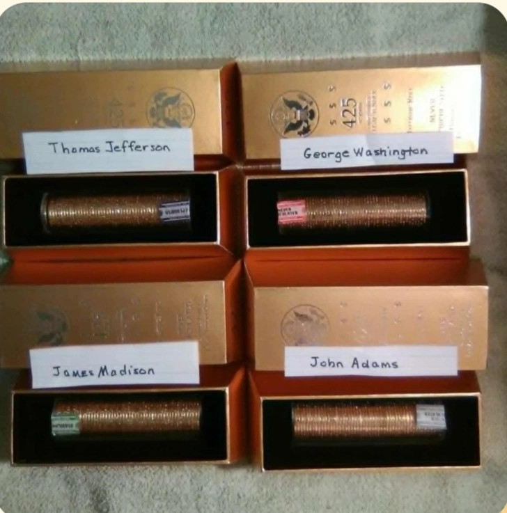 Selling a Presidential Dollar Coin Collection featuring four presidents: Thomas Jefferson, George Washington, James Madison, and John Adams. Each set of coins comes in its original box. Great for collectors!