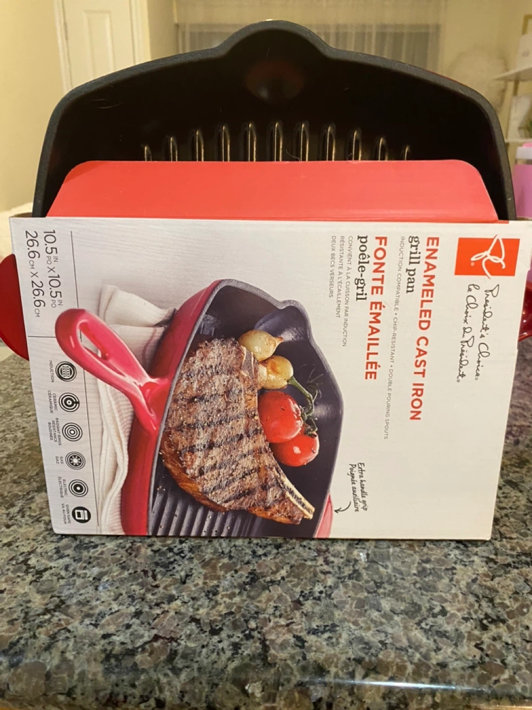 10Selling a President's Choice enamelled cast iron grill pan! It's induction compatible, chip-resistant, and has double pouring spouts. The dimensions are 10.5 x 10.5 x 10.5 inches (26.6 x 26.6 x 26.6 cm). Great for grilling indoors or outdoors