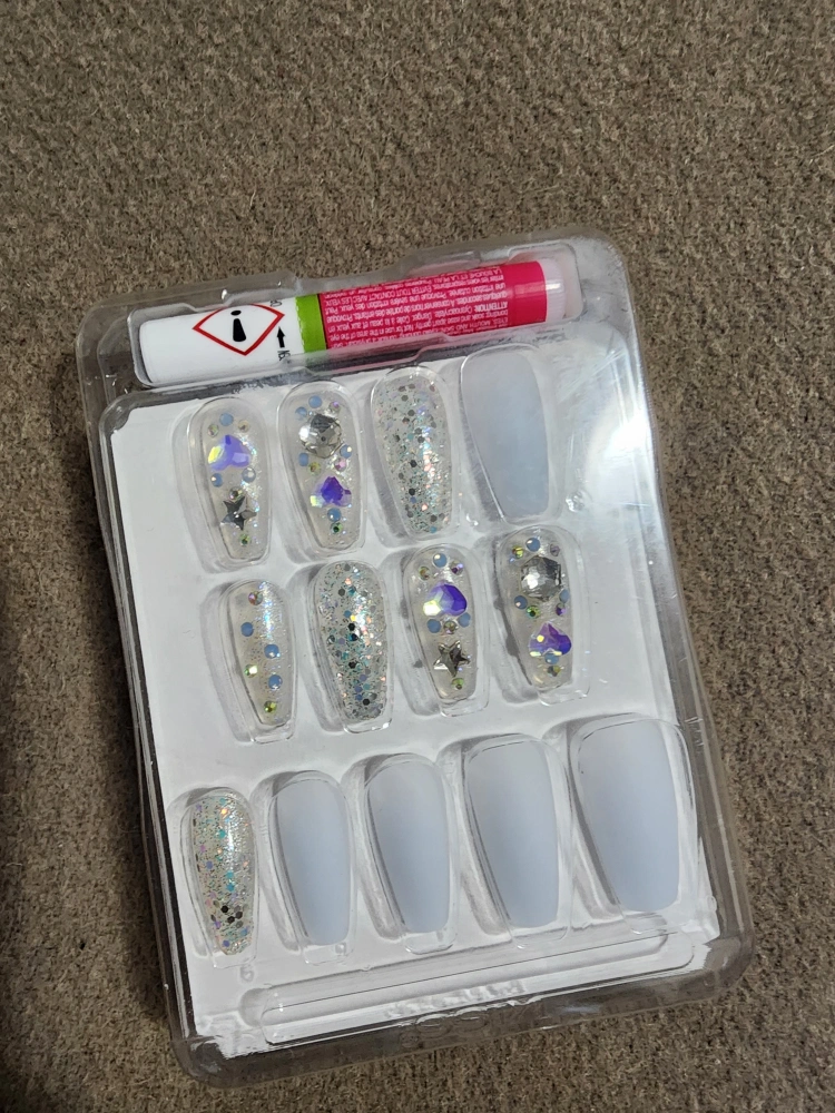 10Selling a set of press-on nails with glue. They have a cute design with stars and hearts! Perfect for a quick and easy manicure