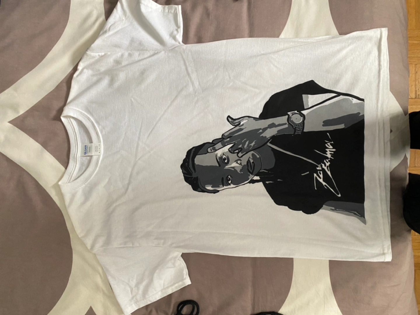36Men's white t-shirt. Features a graphic of Pressa Armani. Short sleeves, crew neck. Good condition.