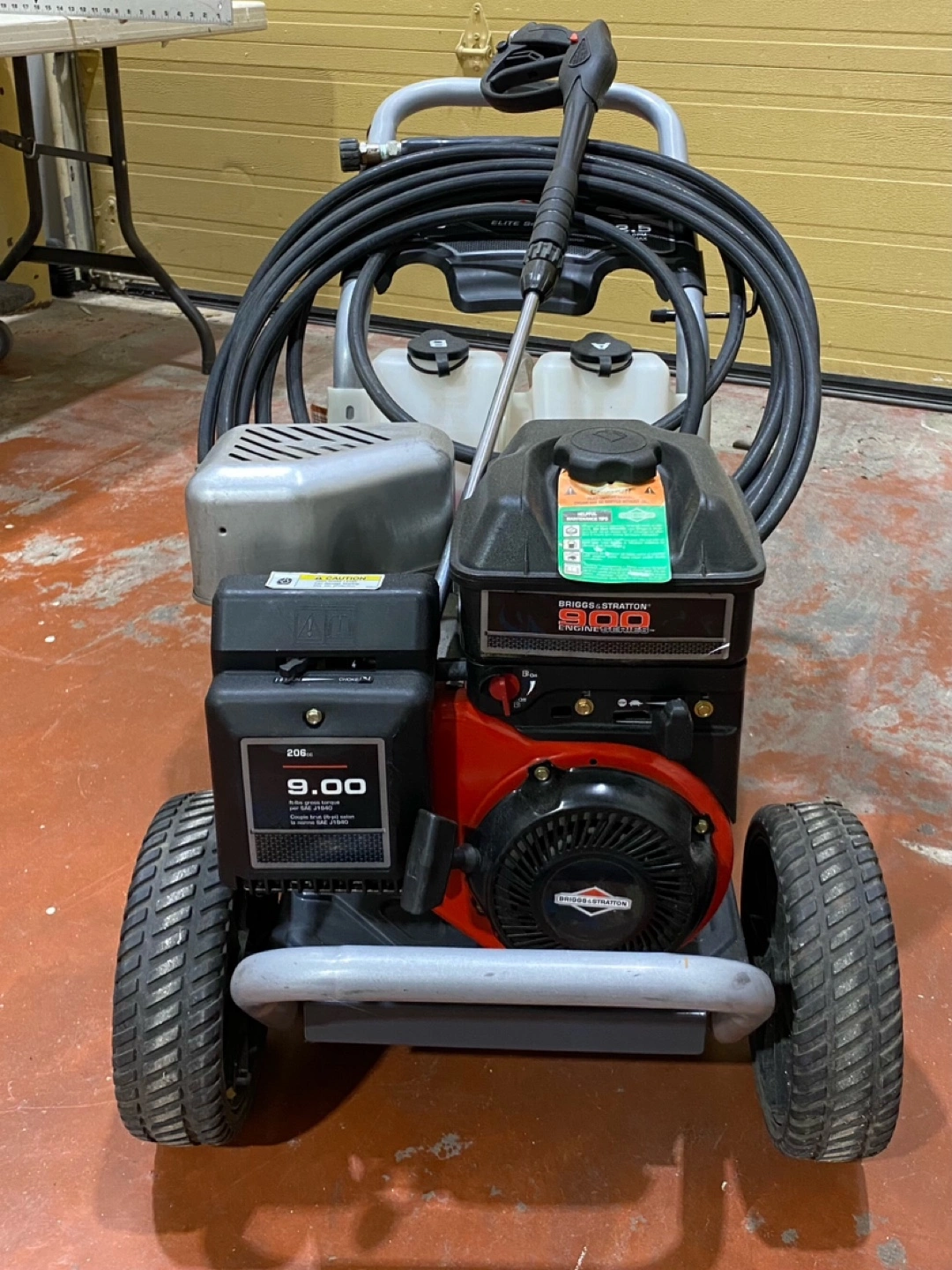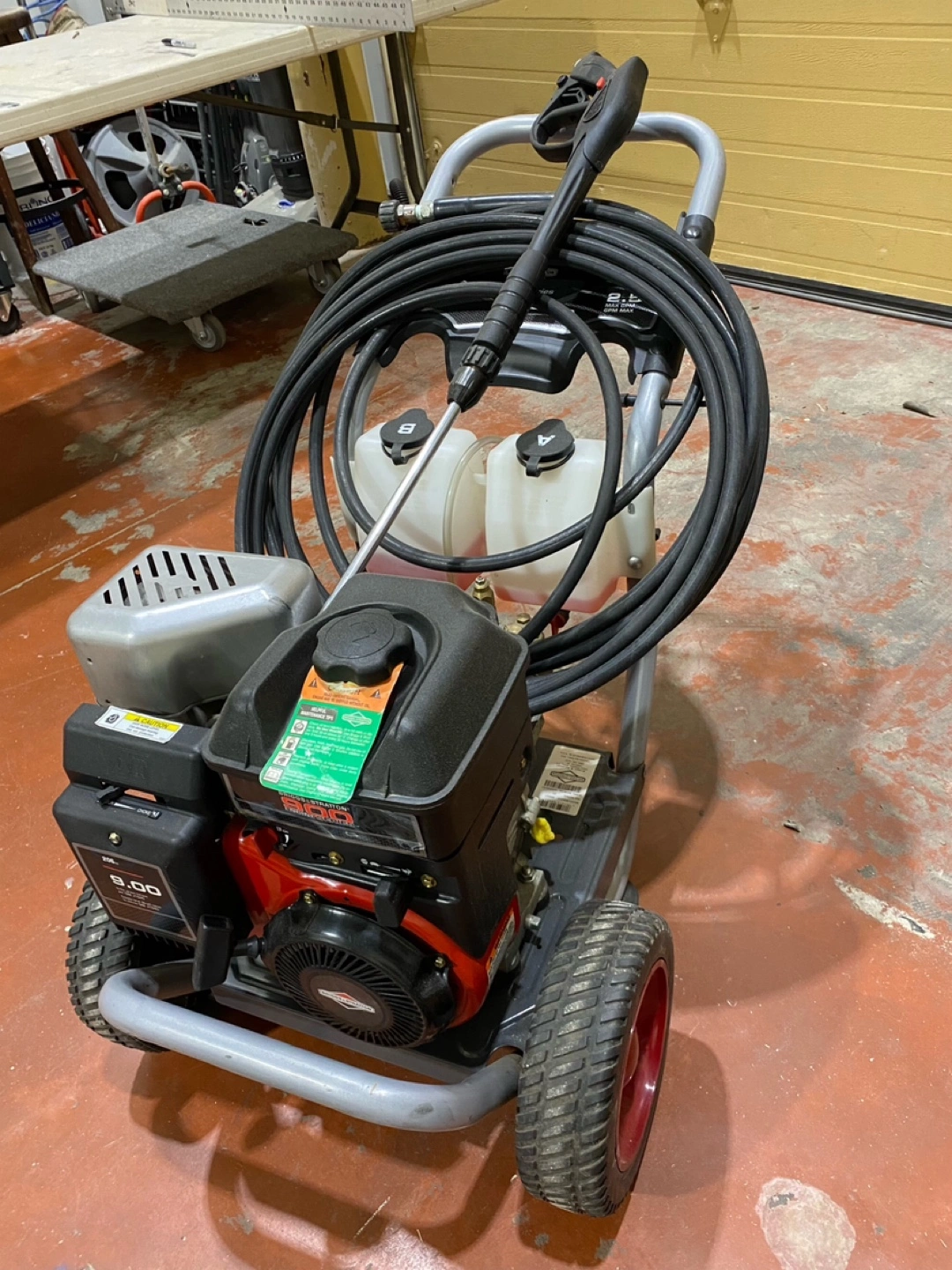 A pressure washer with a metal frame. Includes a long hose, spray handle, and two white containers. It can be relaxing to use this to clean things around your house.
