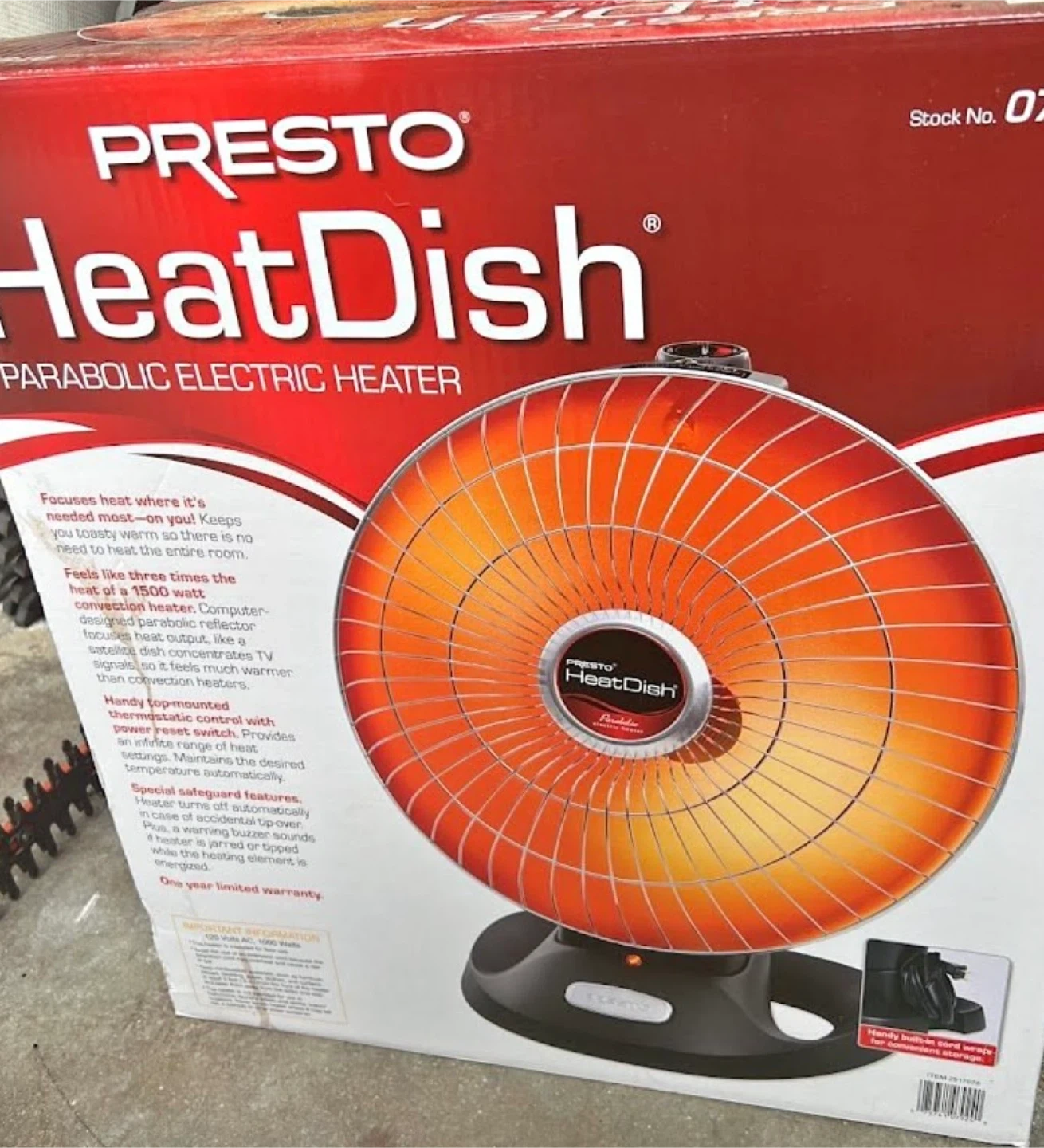 $30-Brand new used it 2 times No box tho !!! I'm selling a Presto HeatDish parabolic electric heater! It focuses heat where it's needed most, so you stay toasty warm without needing to heat the entire room. It feels like three times the heat of a 1500 watt convection heater. It also has handy top-mounted thermostatic control with a power reset switch, providing an infinite range of heat settings and maintaining the desired temperature automatically. The heater also has special safeguard features, turning off automatically in case of accidental tip-over, and a warning buzzer sounds if the heater is jarred or tipped.