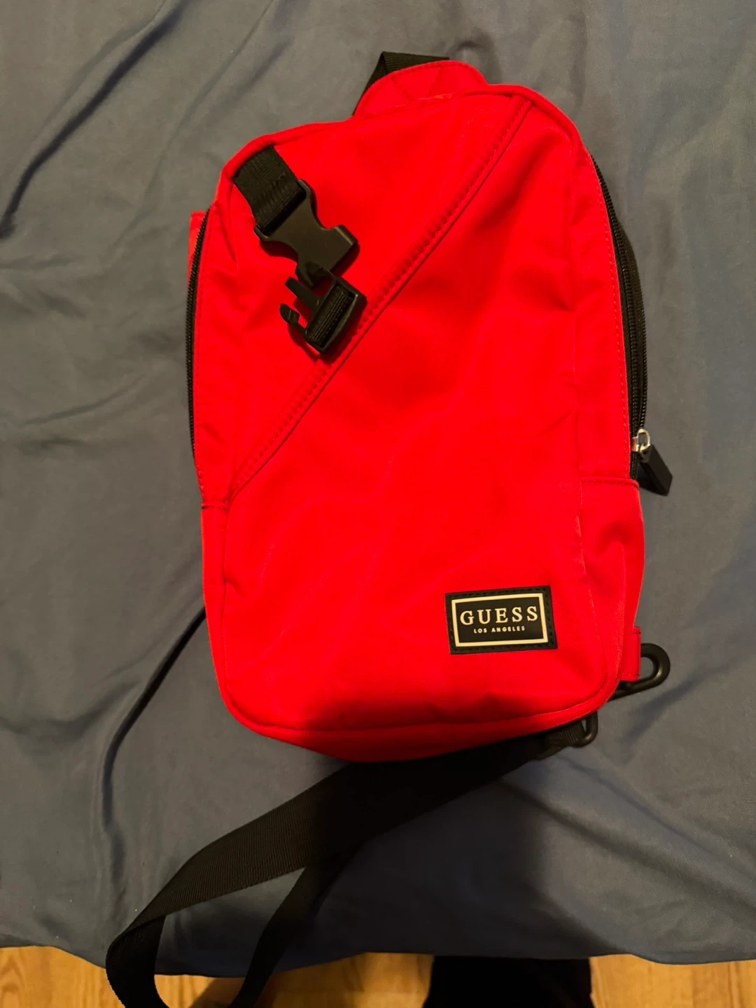 This red Guess sling bag is a great accessory. It's made of durable material and has an adjustable strap with a buckle closure. This bag is perfect for carrying your essentials on the go!