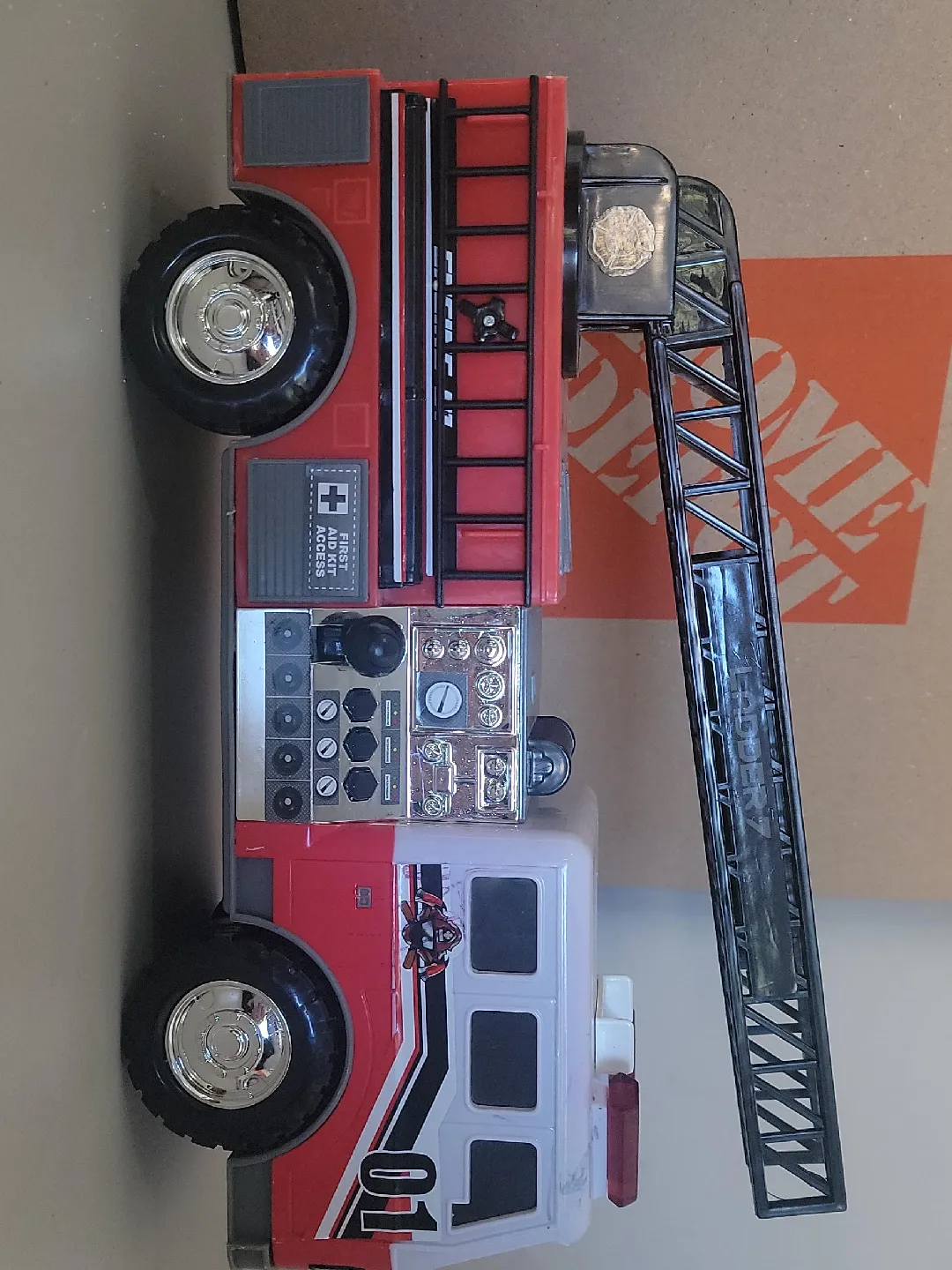 Here's a fun toy firetruck ready for a new home! It's red and white with a ladder and cool details like a first aid kit access point. Great for imaginative play!