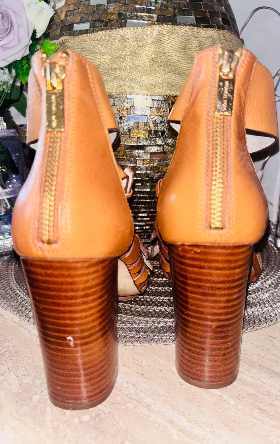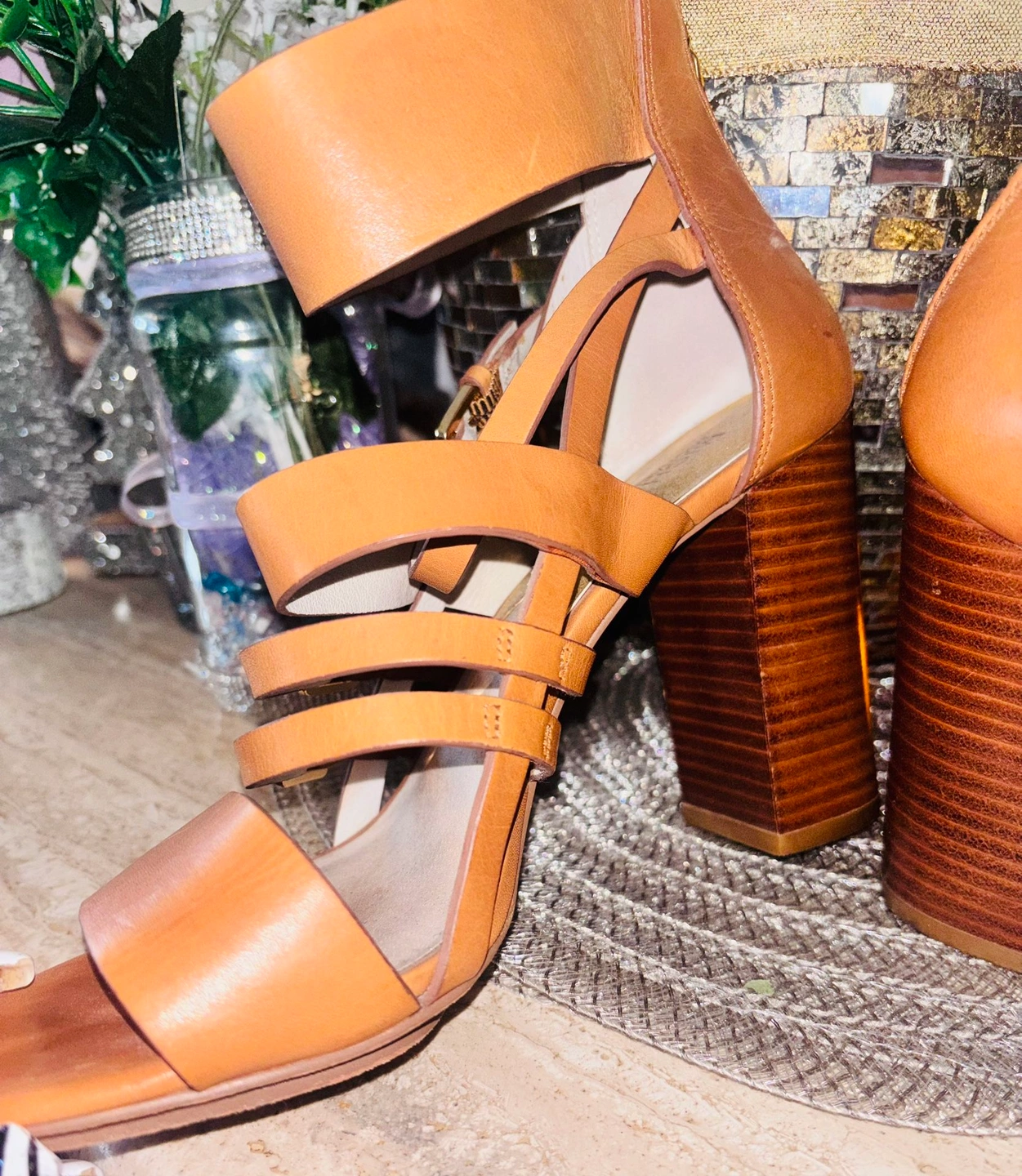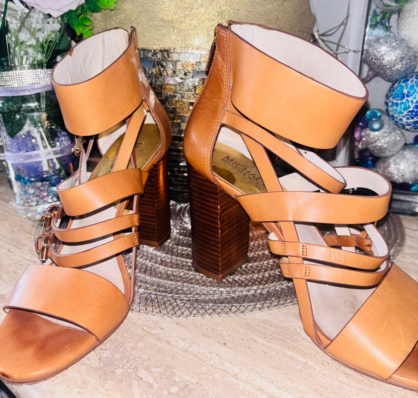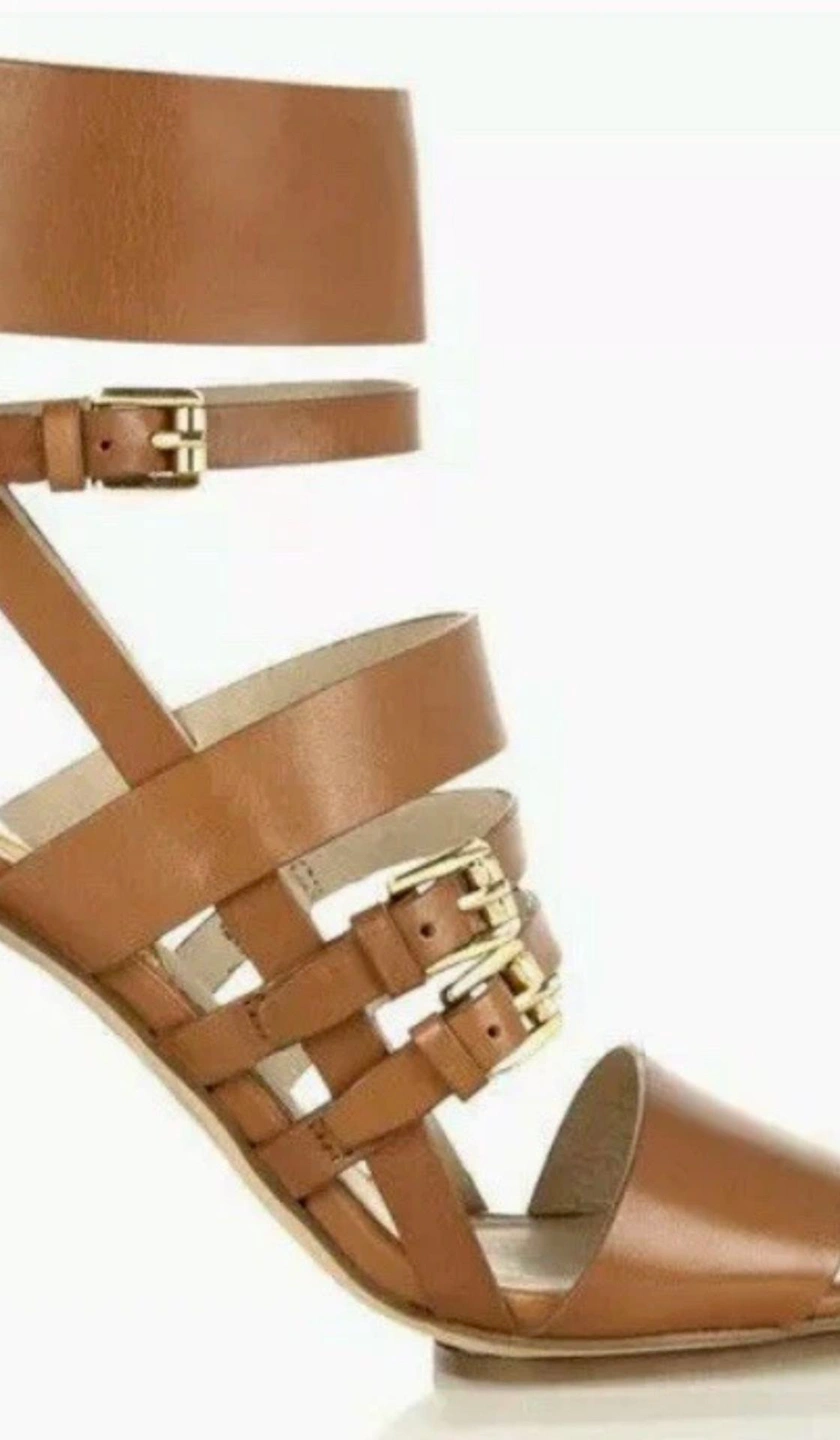 Step out in effortless style with these gorgeous Michael Kors gladiator sandals in a classic tan leather finish. Designed with a flattering multi-strap silhouette, a wide ankle cuff, and a sturdy stacked block heel, these sandals offer both style and comfort.