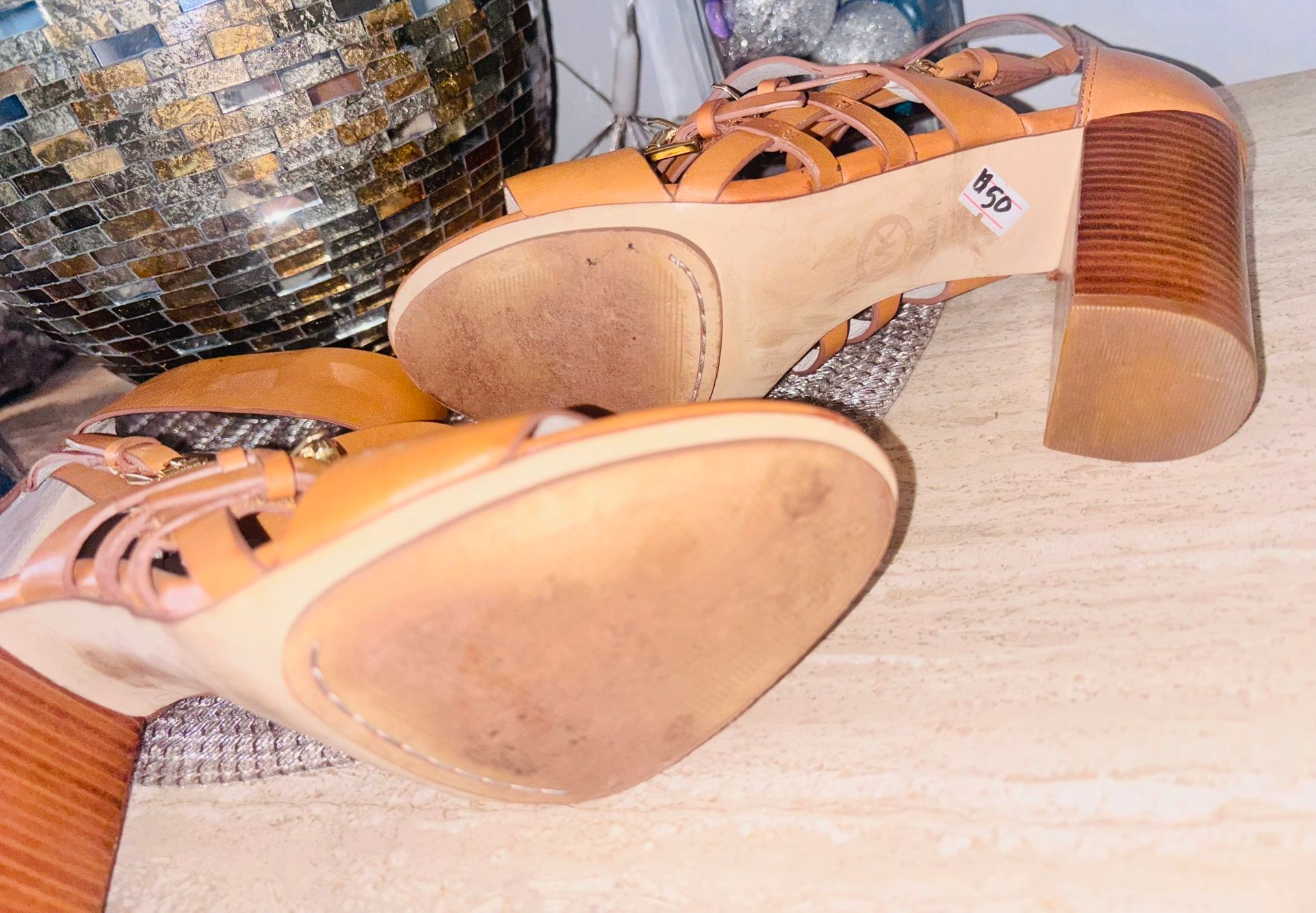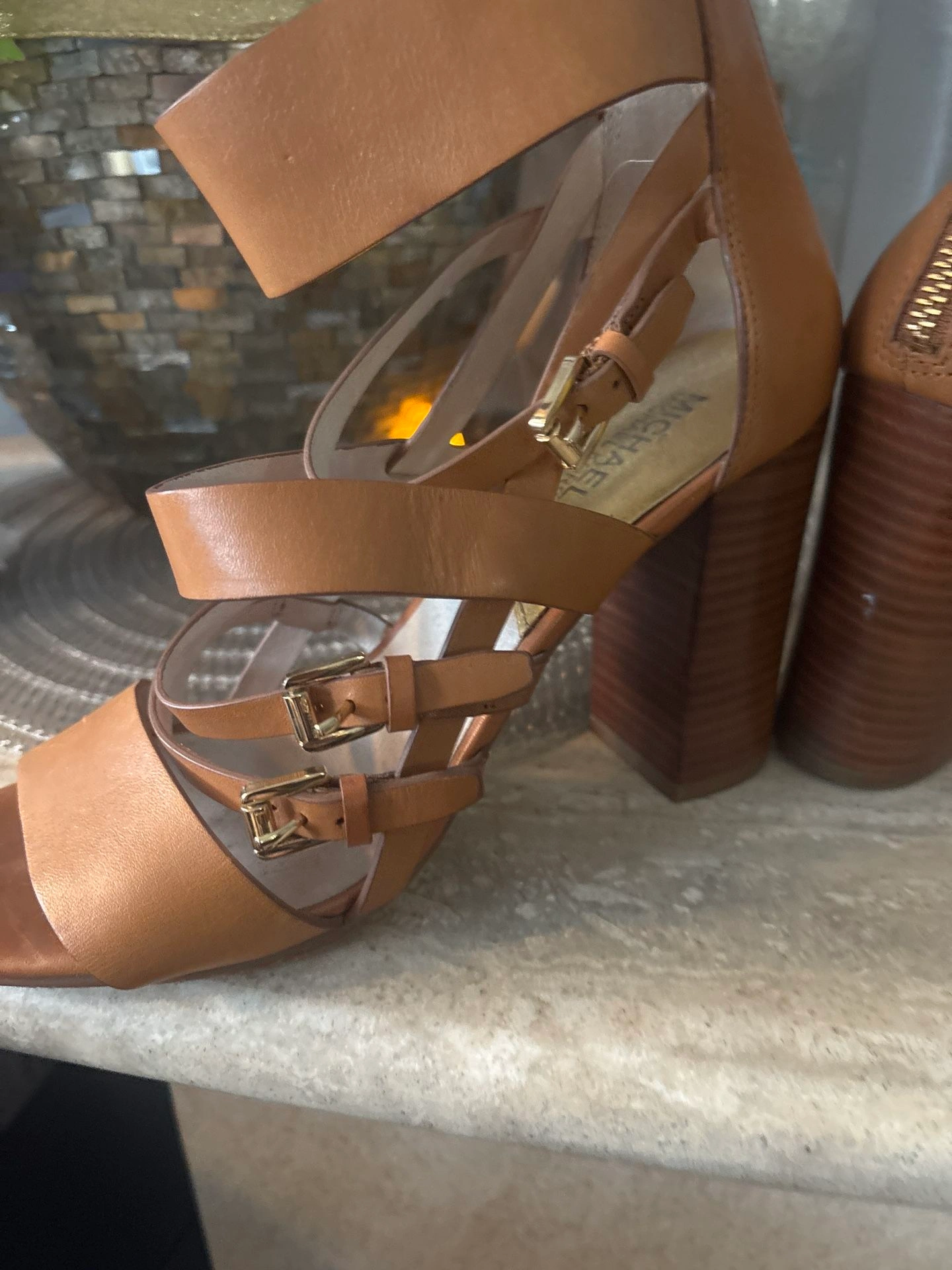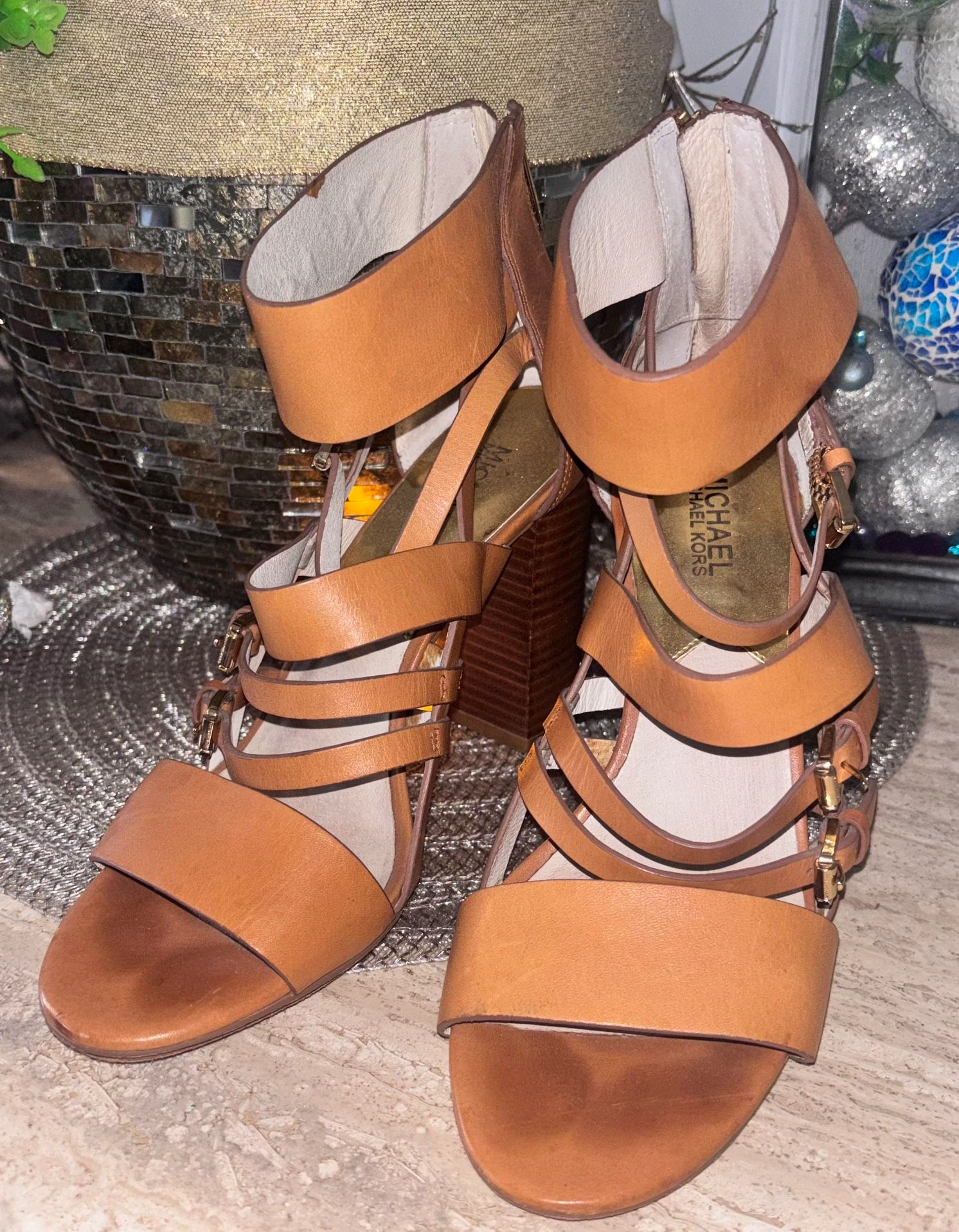 Step out in effortless style with these gorgeous Michael Kors gladiator sandals in a classic tan leather finish. Designed with a flattering multi-strap silhouette, a wide ankle cuff, and a sturdy stacked block heel, these sandals offer both style and comfort.