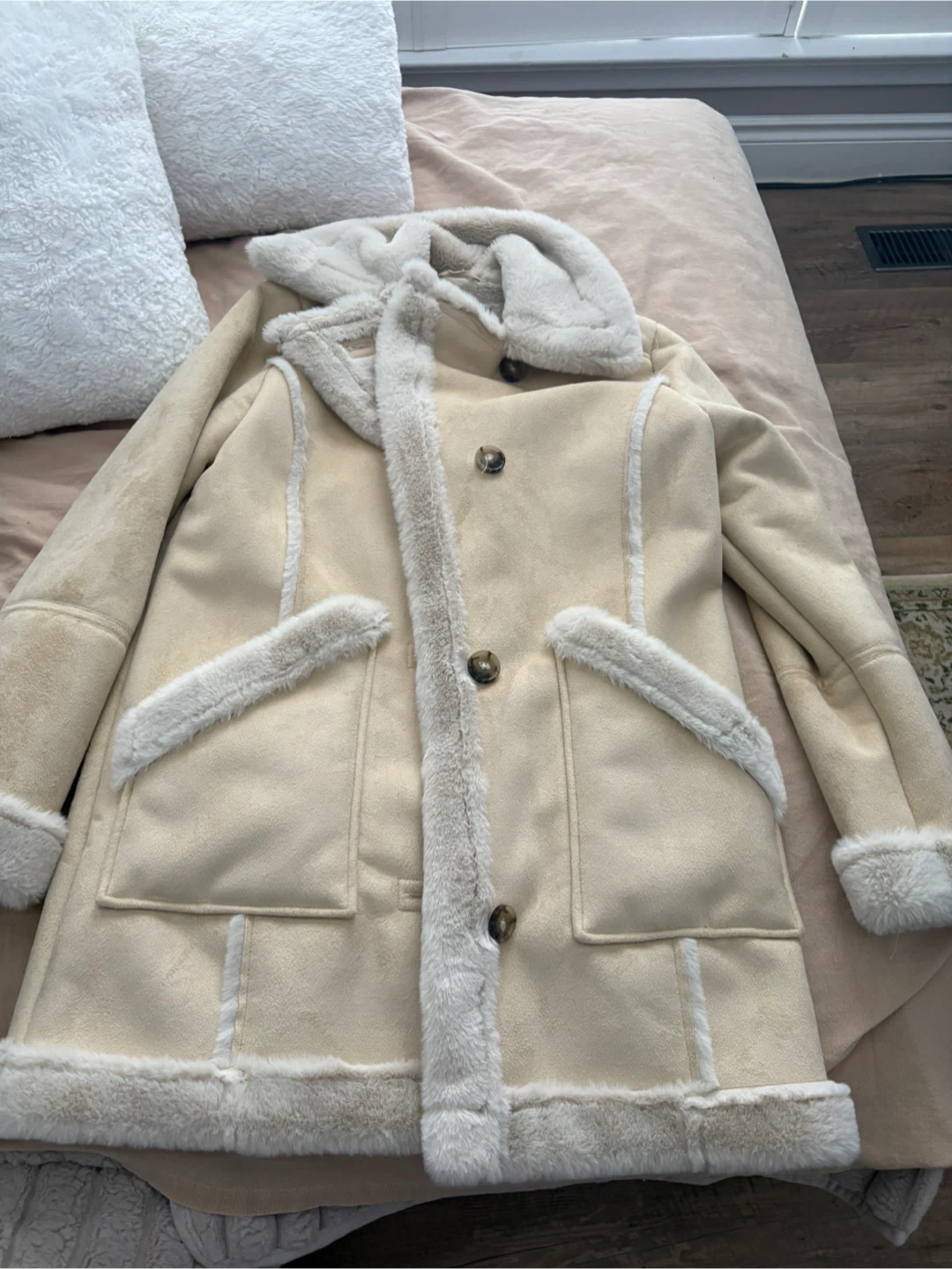 Cream faux suede jacket by Hollister with cozy sherpa lining. It's a size S with button closure and functional pockets. Perfect for staying warm on cooler days!