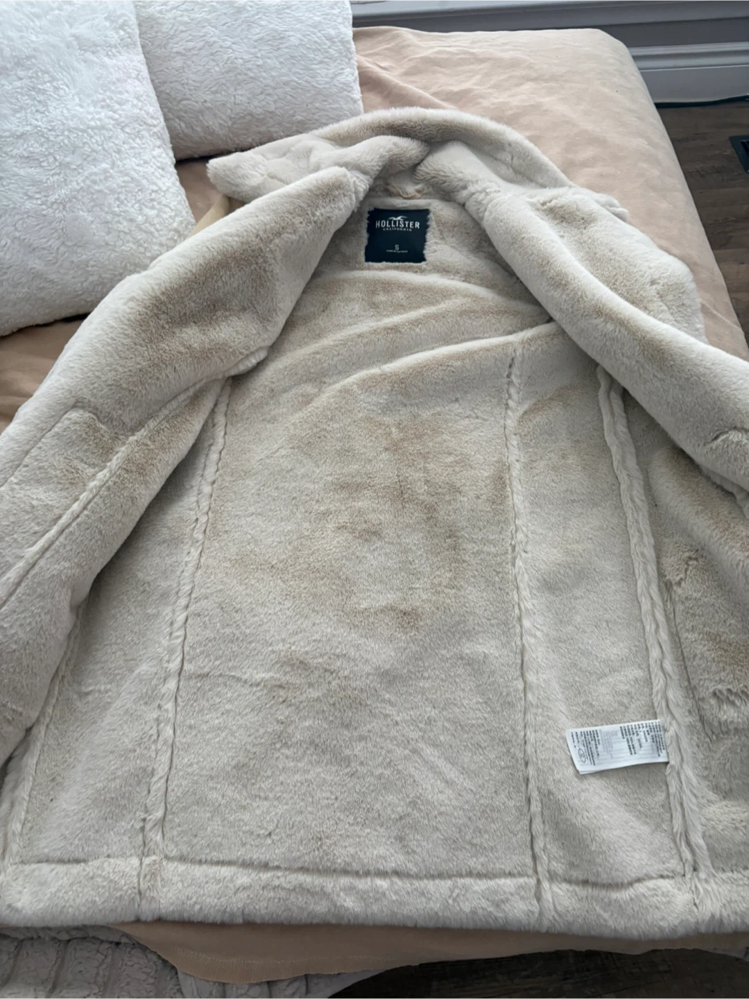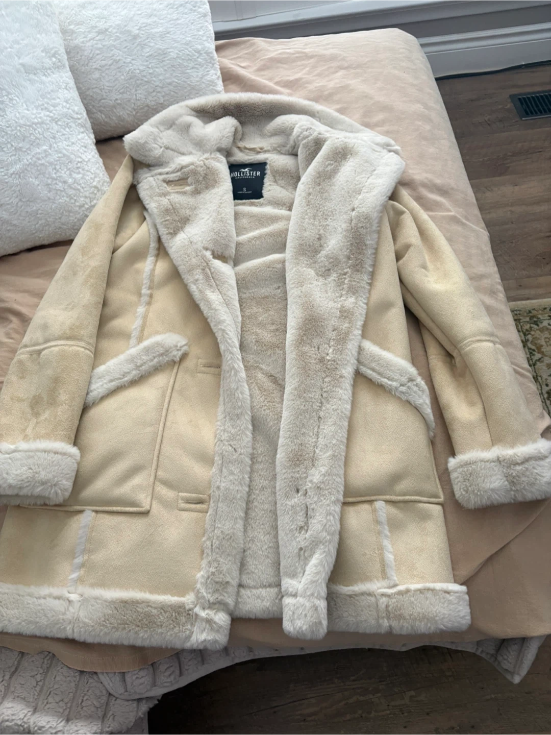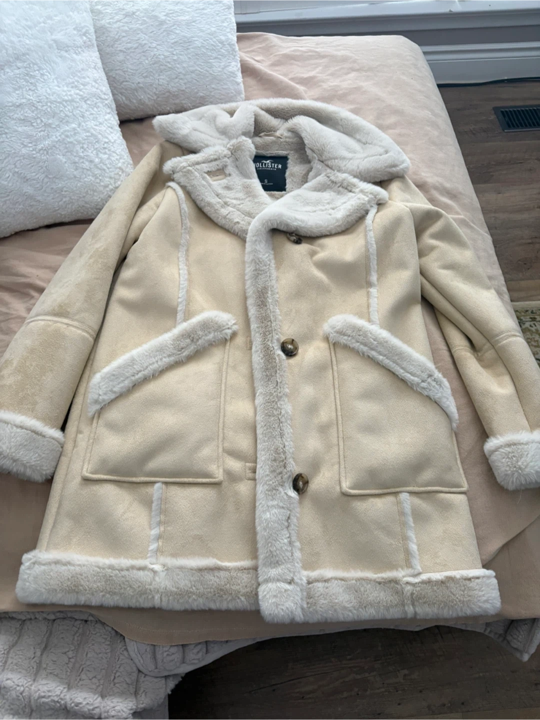 Cream faux suede jacket by Hollister with cozy sherpa lining. It's a size S with button closure and functional pockets. Perfect for staying warm on cooler days!