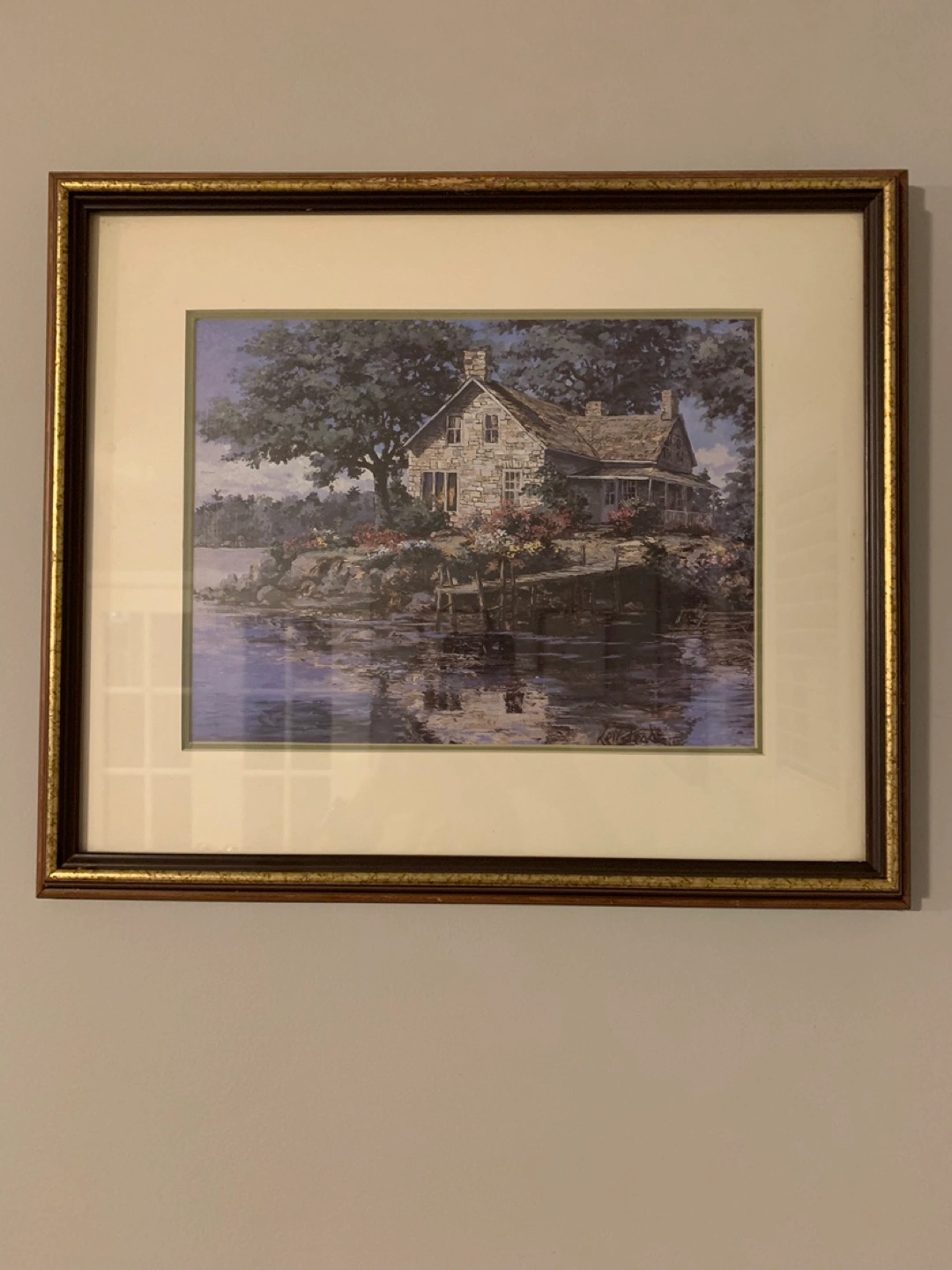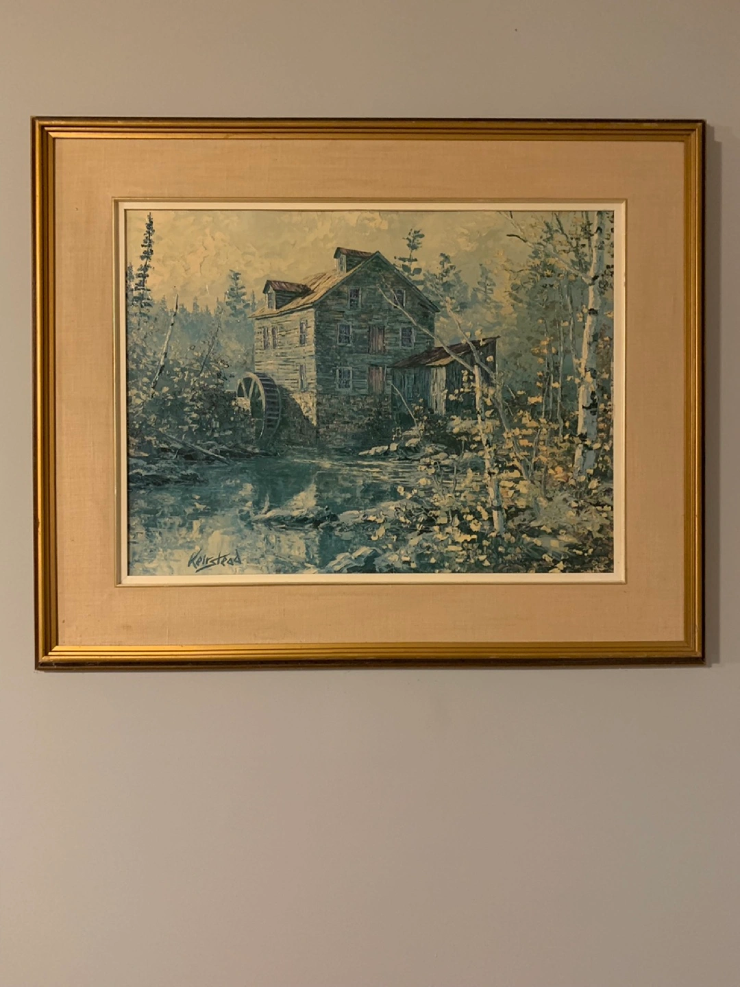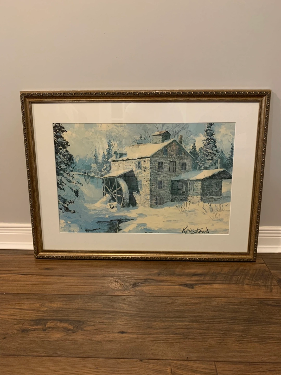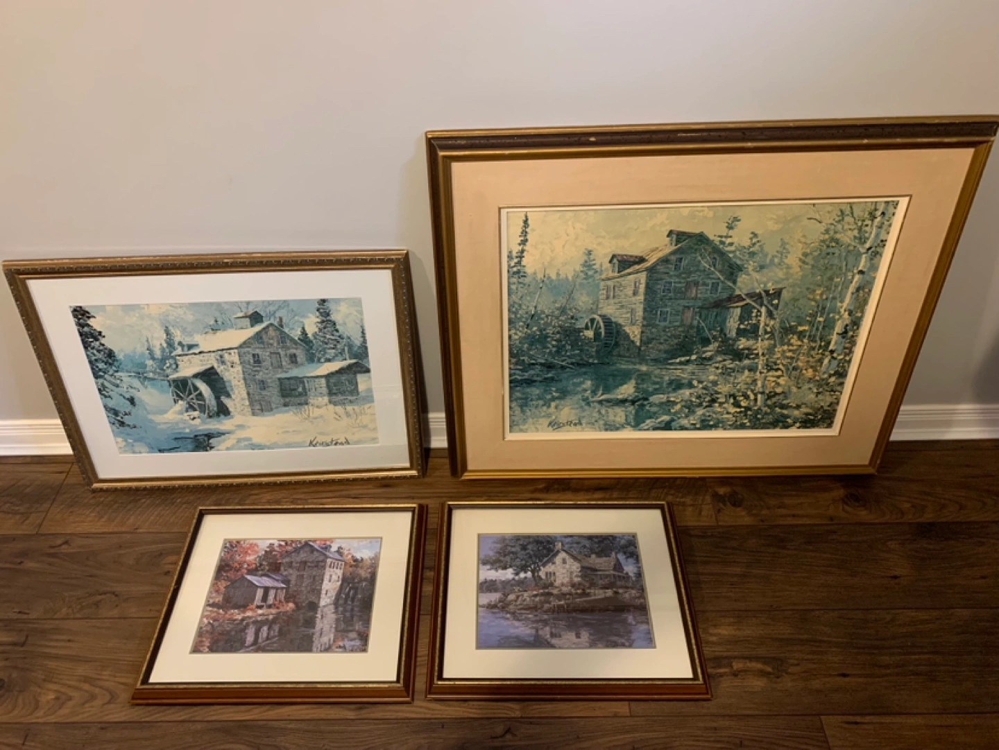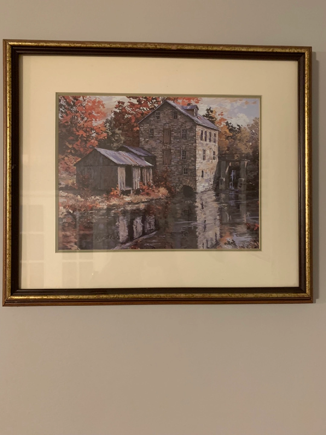654 Framed prints of a mill. The artist's signature is visible in the bottom right corner of the print. The print is in good condition with a few small marks on the frame. Any print $10 each. 27x22-Birch Creek Mill 24x16- The Mill At Kings Landing 19x15- Gallery On The Lake - SOLD 19x15- (unknown title)- SOLD