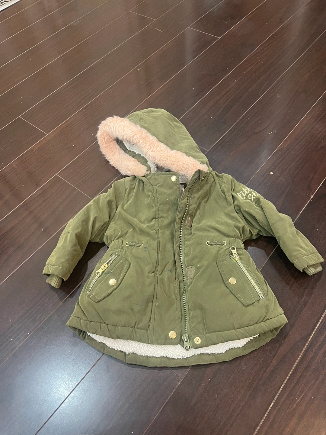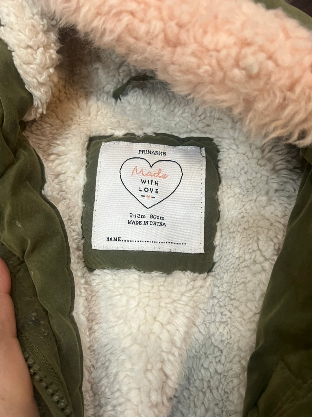 A cute and cozy olive green winter coat from Primark for your little one! This jacket is sized for 9-12 month olds (60cm). It's lined with a soft, warm material, perfect for keeping your baby snug during the colder months