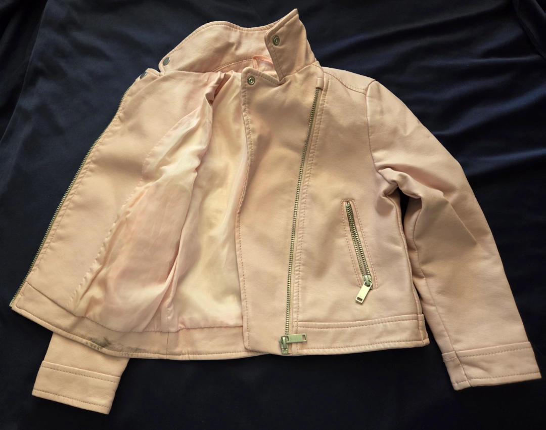 Here's a cute pink biker jacket from Primark! It's in great condition and perfect for a little one aged 5-6 years. The jacket features a classic biker style with zippers and a soft, comfortable lining. It would be a stylish addition to any child's wardrobe! True colour is the last picture. Lighting and background changed the color of the other pictures.