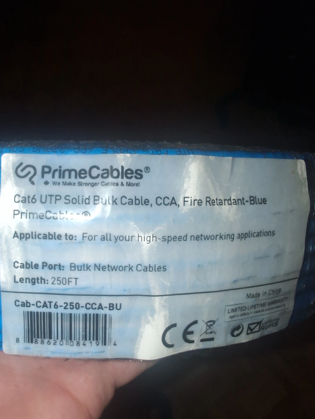 65Selling a PrimeCables Cat6 UTP solid bulk cable. It's CCA, and fire retardant in blue. The cable length is 250FT and is applicable for high-speed networking applications. Model number: Cab-CAT6-250-CCA-BU