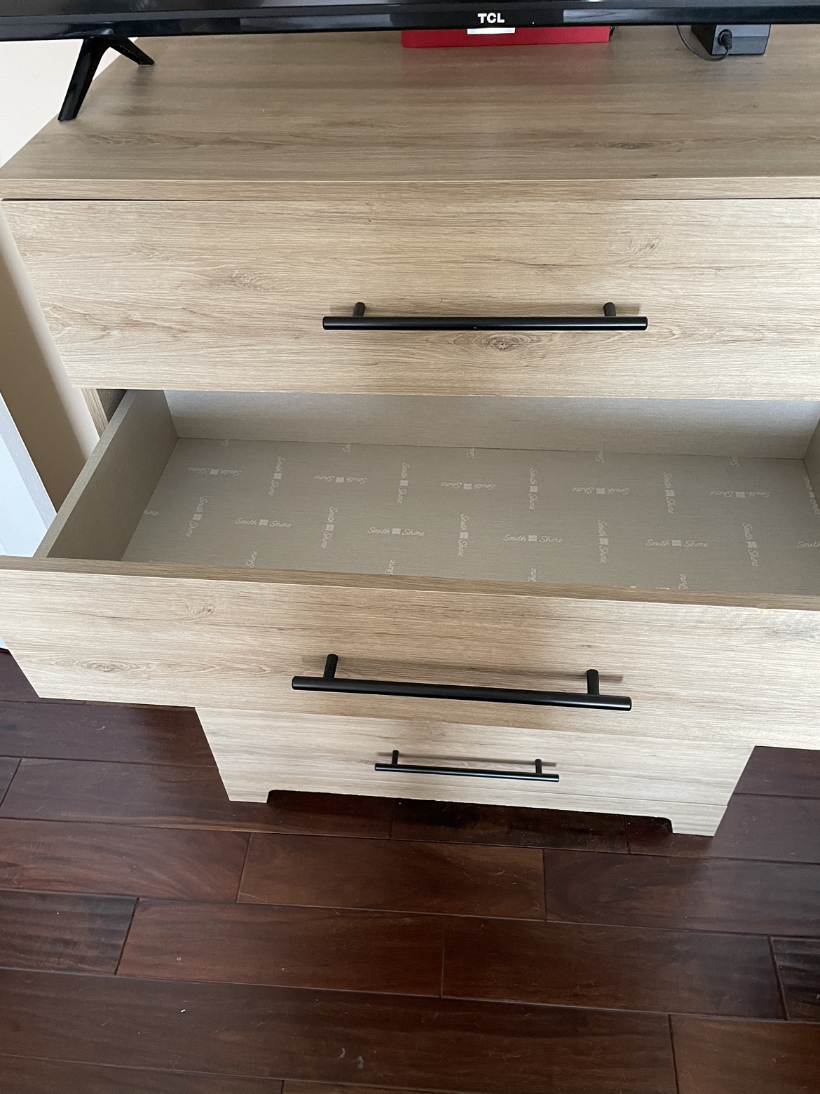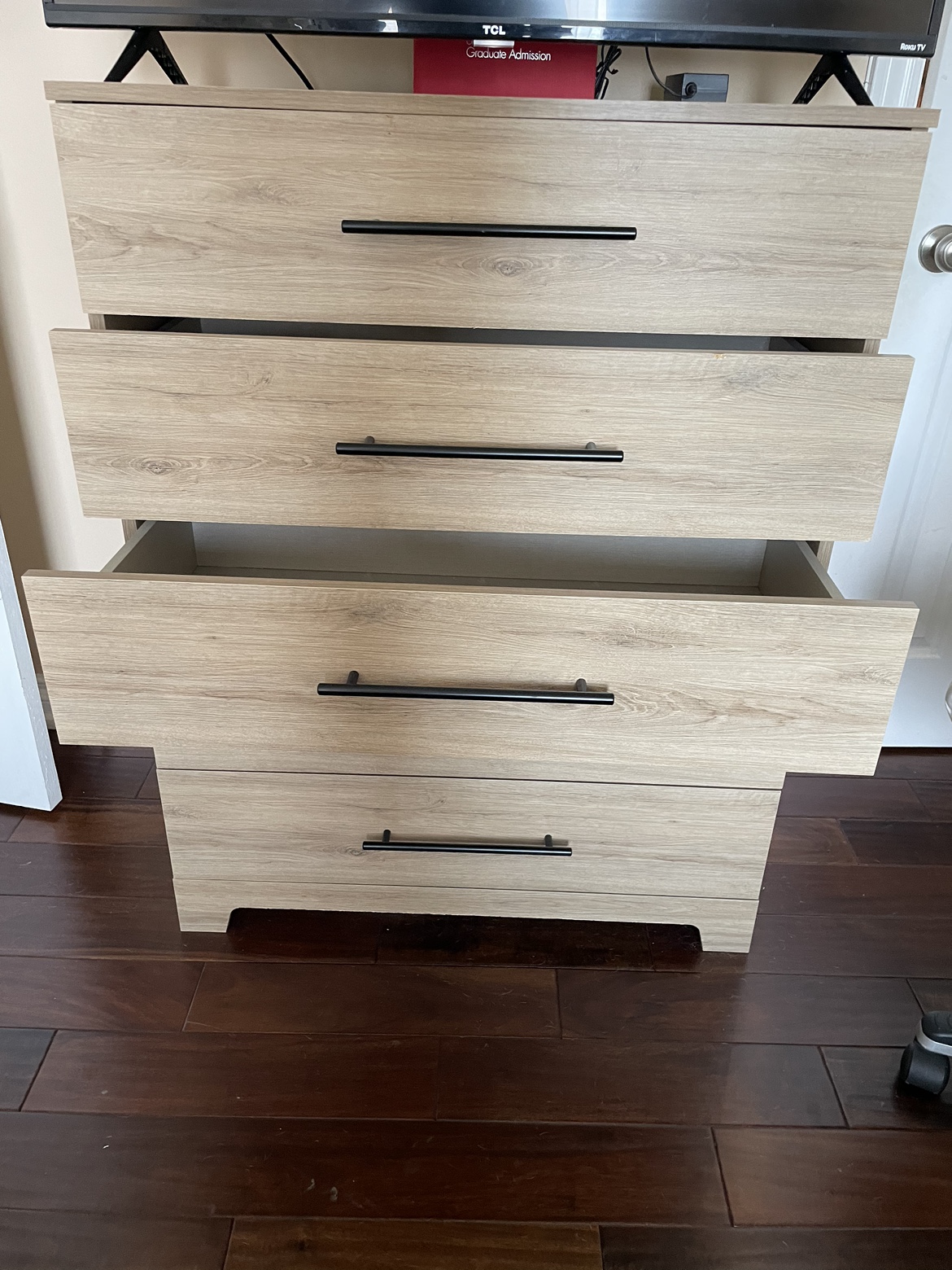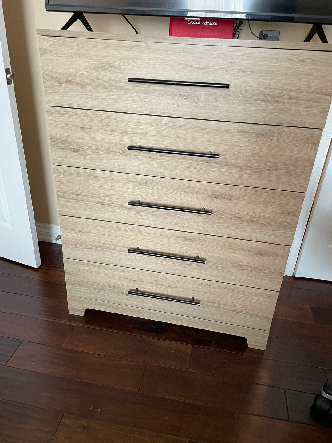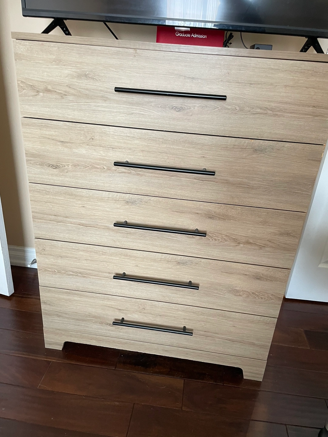 39Overall 42.5'' H X 33'' W X 19'' D Main Drawer Interior 4.38'' H X 15'' D This 5-drawer chest is a modern twist on a classic. Its contemporary lines, enhanced by a delicately curved plinth, breathe life into a piece that’s both elegant and timeless. The metal handles add a touch of finesse and character, making this chest suitable for any type of bedroom. Designed with space constraints in mind, this chest features five generous drawers, offering abundant storage for all your clothes and accessories. With metal drawer slides ensuring smooth opening and closing. Link to new: https://www.wayfair.ca/furniture/pdp/south-shore-primo-5-drawer-chest-th4097.html
