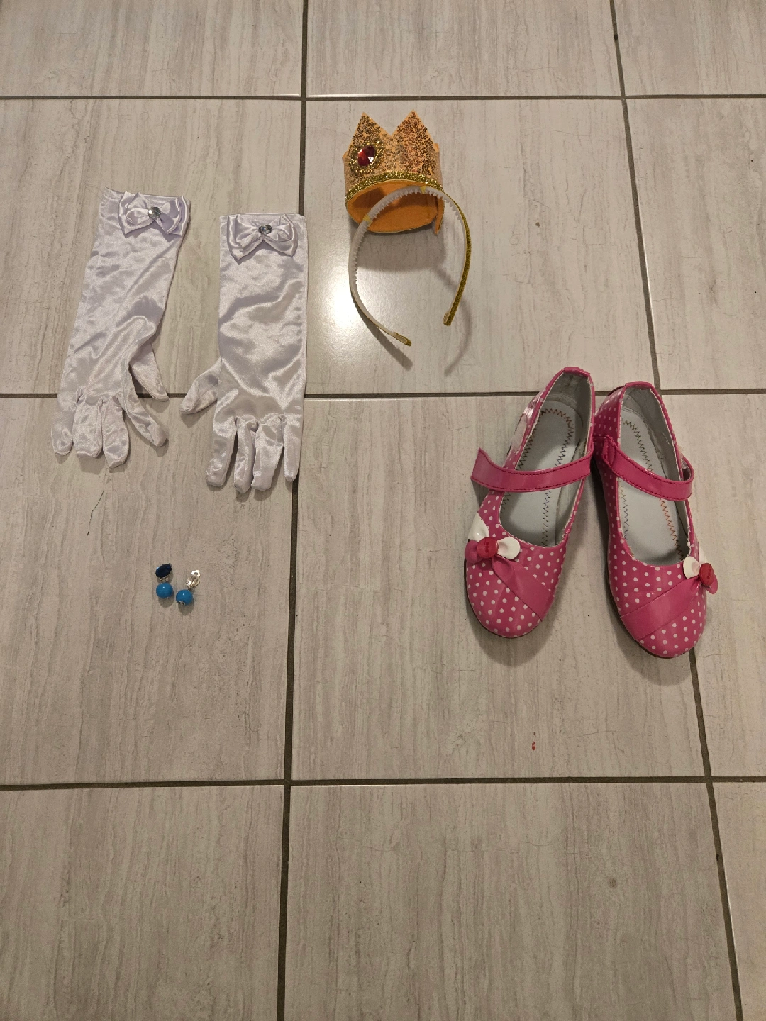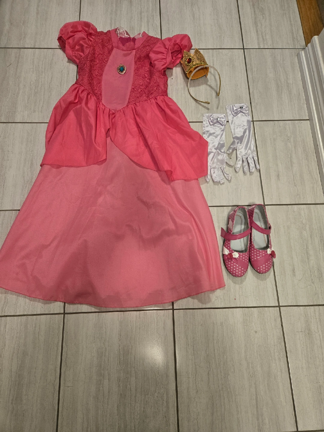 10Selling a Princess Peach costume! It comes with the dress, a crown, a pair of gloves, a pair of shoes, and earrings. Perfect for dress-up or Halloween!