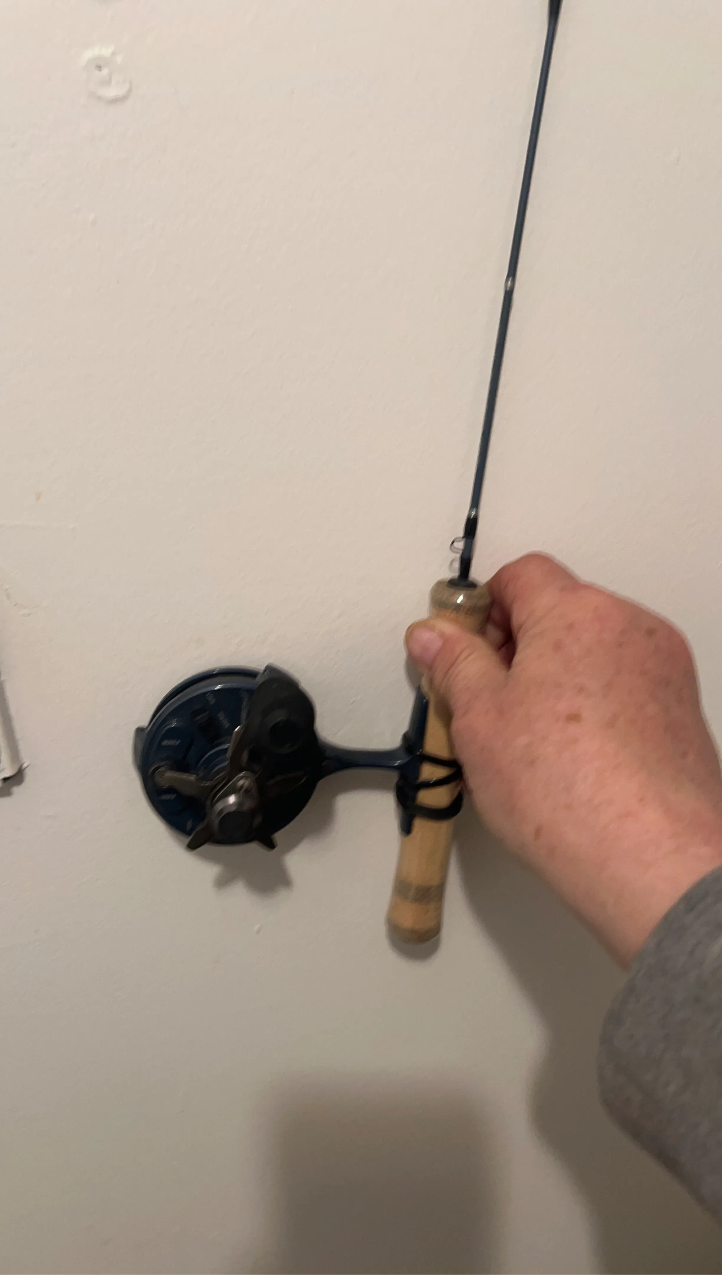 A handy ice fishing rod and reel combo. It features a wooden handle for a comfortable grip. Perfect for setting up at your favourite ice fishing spot!