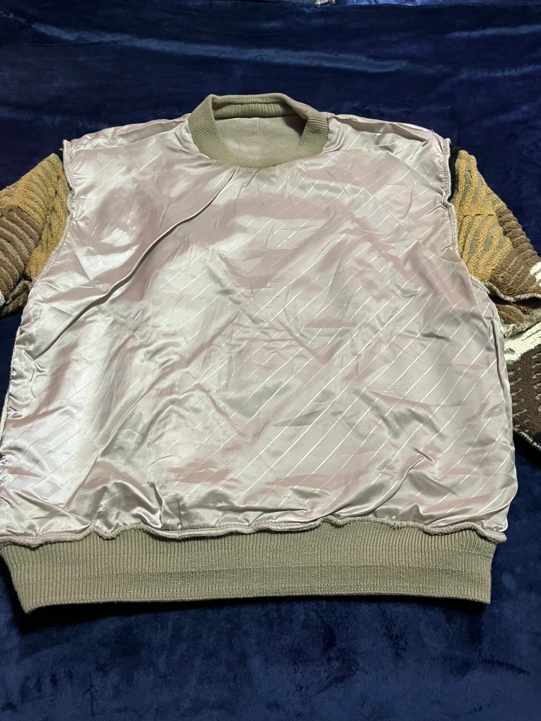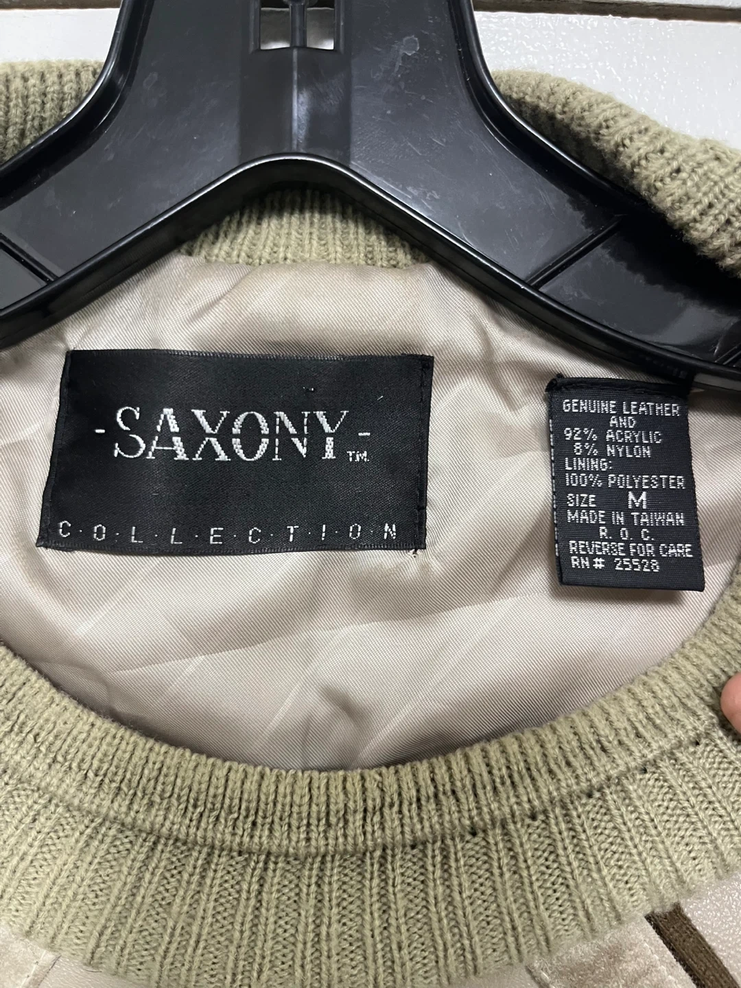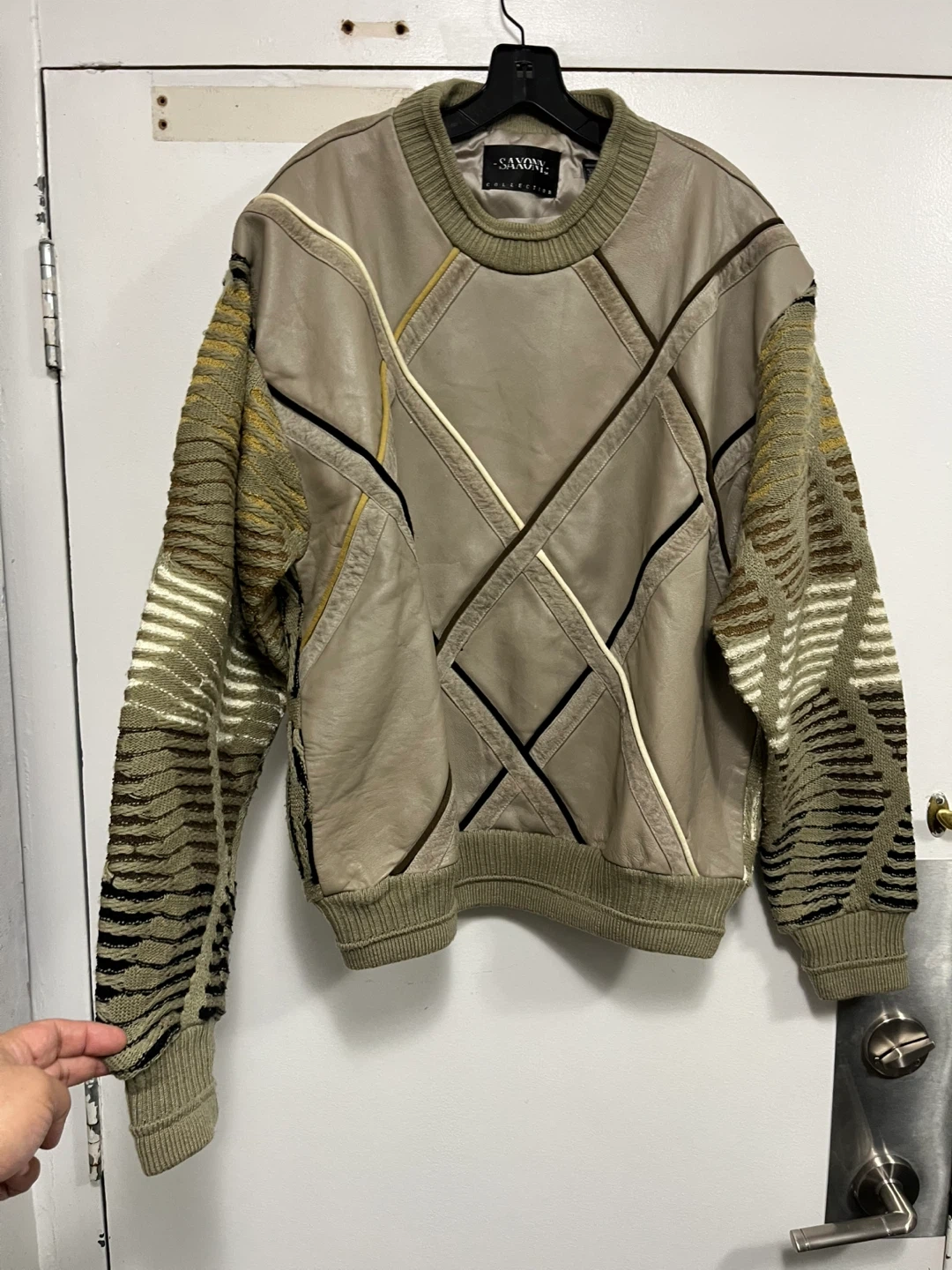 This Saxony Collection sweater features a unique patchwork design with genuine leather panels and intricate knit sleeves and back. It's made from 92% acrylic, 8% nylon with a 100% polyester lining. Size medium.inside is lined at the front