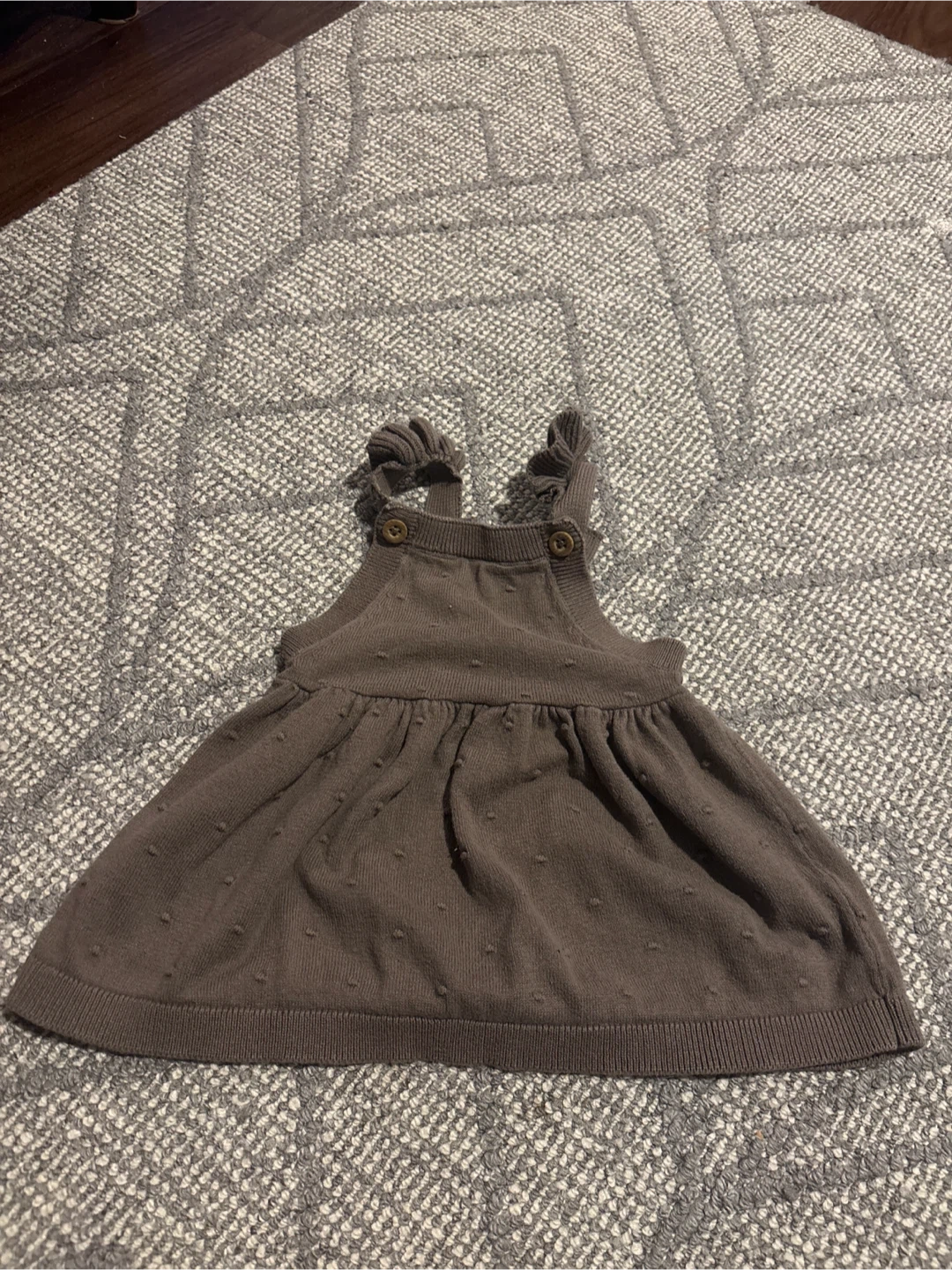 A cute brown knit sweater dress with a gathered skirt and button details on the straps. It features a subtle dotted texture throughout the fabric.